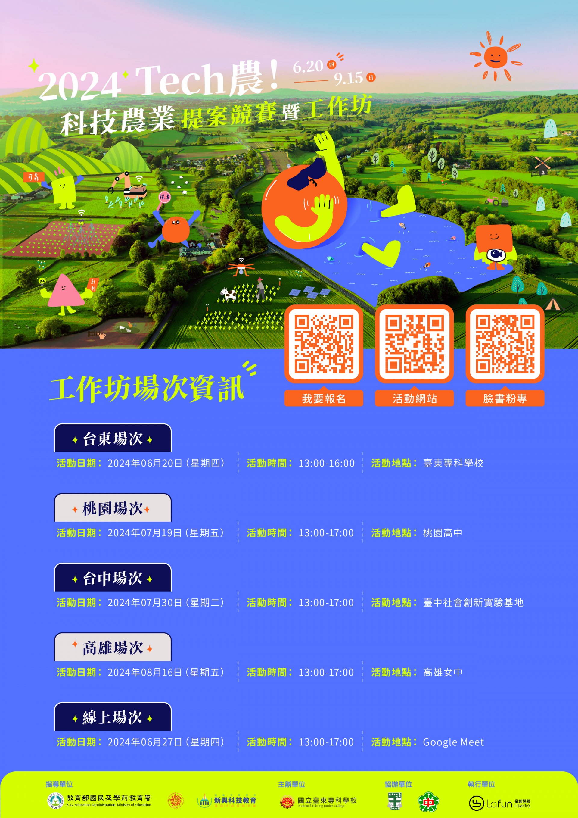 (二) 報名參與工作坊:針對本次競賽,將辦理五場科技創新工作坊「Tech農!2024科技創新工作坊」。共辦理6月27日線上視訊場,7月19日北部、7月30日中部、8月16日南部、6月20日東部共4場實體工作坊。即日起開放報名,依各場次報名截止日期不同,各場次人數有限,額滿為止。工作坊報名網址: https://forms.gle/8N8CYWQjtvhYSuoD9 。