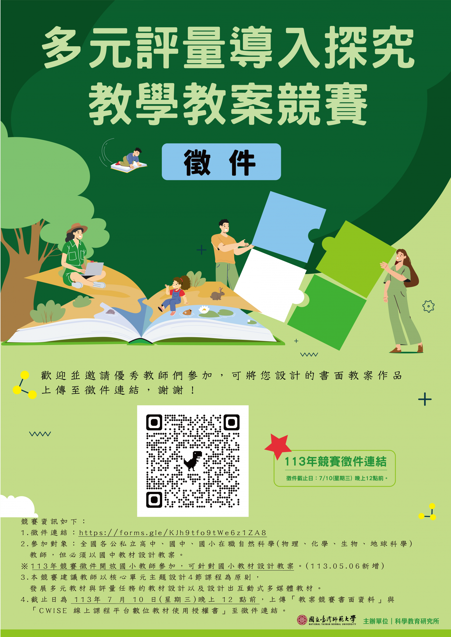 國立臺灣師範大學辦理「多元評量導入探究教學教案競賽」徵稿實施計畫乙案,鼓勵相關教師參加,請查照。