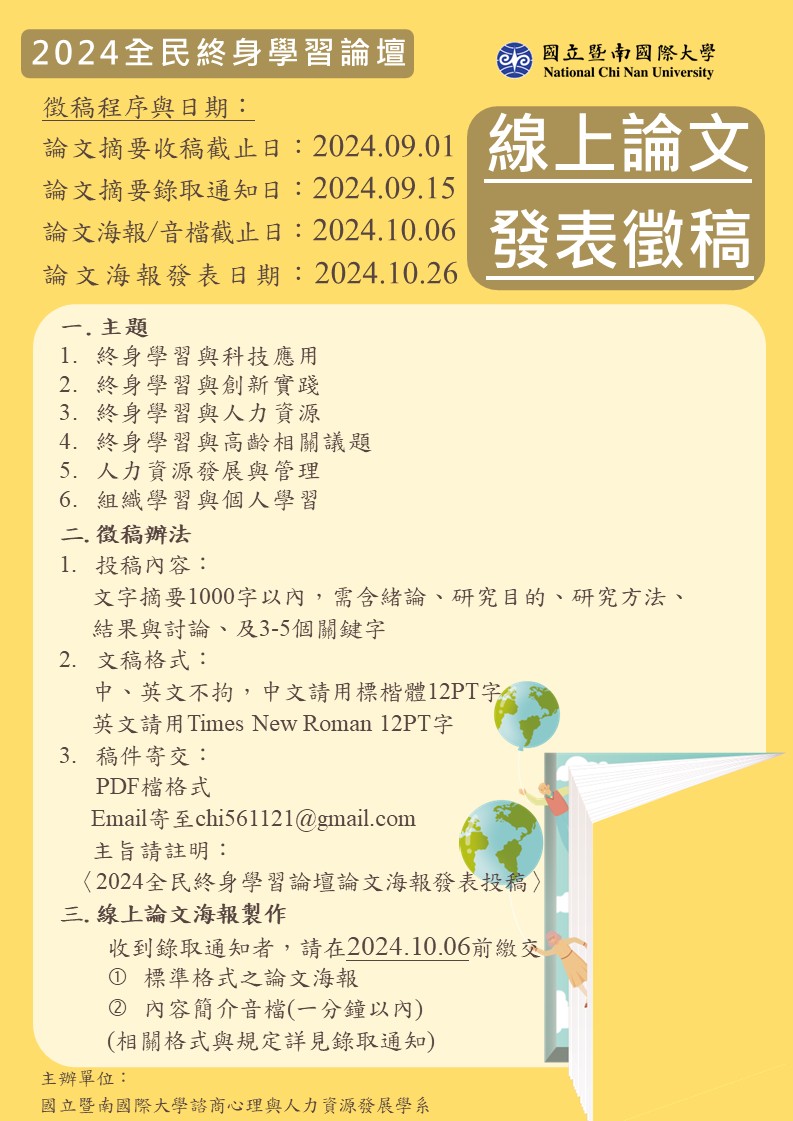 轉知國立暨南國際大學諮商心理與人力資源發展學系主辦之「2024全民終身學習論壇:終身學習x人力資源發展的遇合及挑戰」線上論壇,歡迎有興趣者踴躍投稿,請查照。