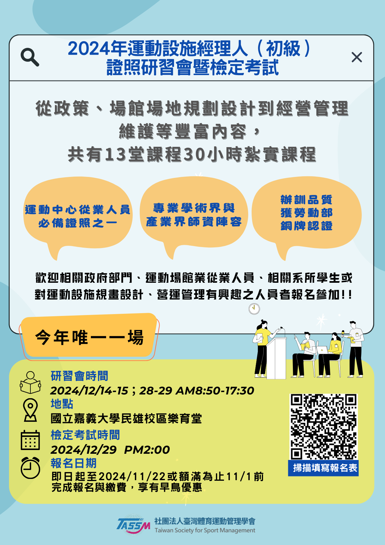 一、依據社團法人臺灣體育運動管理學會 113 年 10 月 8 日臺體管業字第 1130000288 號函辦理。 二、活動時間: 113 年 12 月 14-15 日、 12 月 28-29 日。 三、活動地點:國立嘉義大學(民雄校區)辦理研習會及考試。 四、報名日期:即日起至 2024 年 11 月 22 日(五)止或額滿為止。。 五、報名方式:詳如簡章。