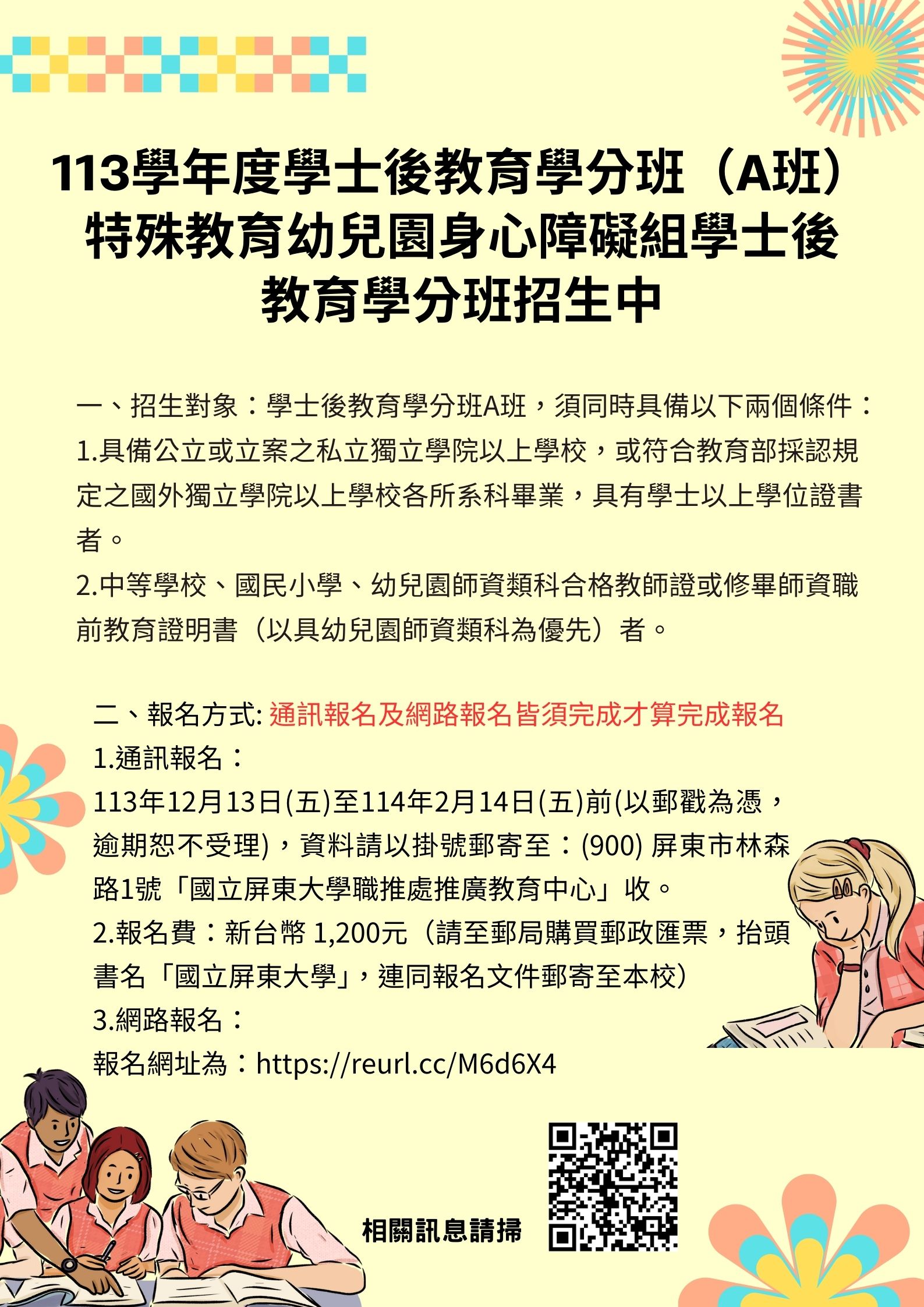 轉知 轉知國立屏東大學辦理「113學年度學士後教育學分班(A班)-特殊教育幼兒園身心障礙組學士後教育學分班」,請符合資格及需求者踴躍報名參加。