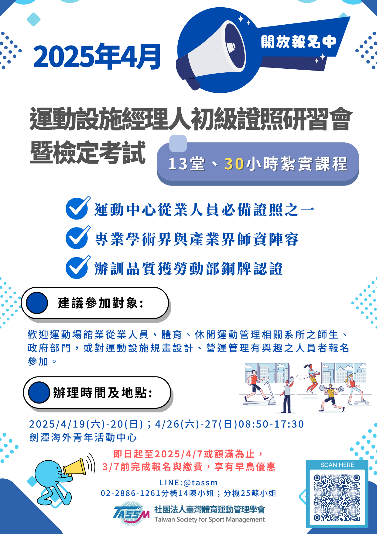 檢送『2025年4月運動設施經理人(初級)證照研習會暨檢定考試』實施計畫及報名相關資訊,鼓勵所屬單位及運動中心相關從業人員踴躍參加,請查照。