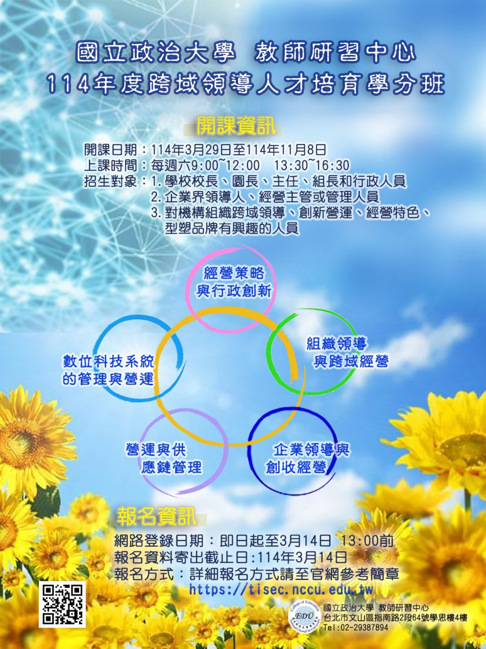 國立政治大學教育學院教師研習中心辦理「114年度跨域領導 人才培育學分班學分班」,目前尚有報名名額,敬請踴躍報名。