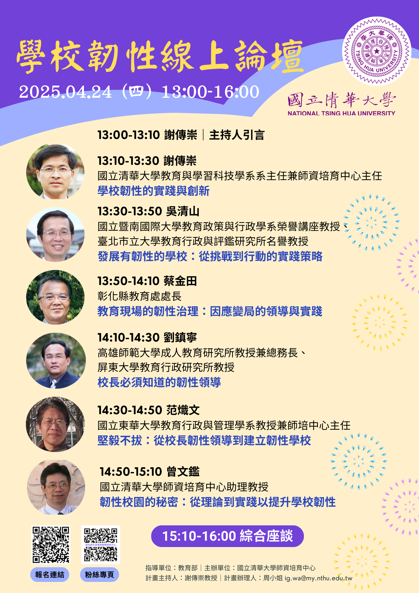 國立清華大學師資培育中心訂於114年4月24日(星期四)下午1時至4時,辦理「學校韌性」線上論壇,敬請踴躍參與。