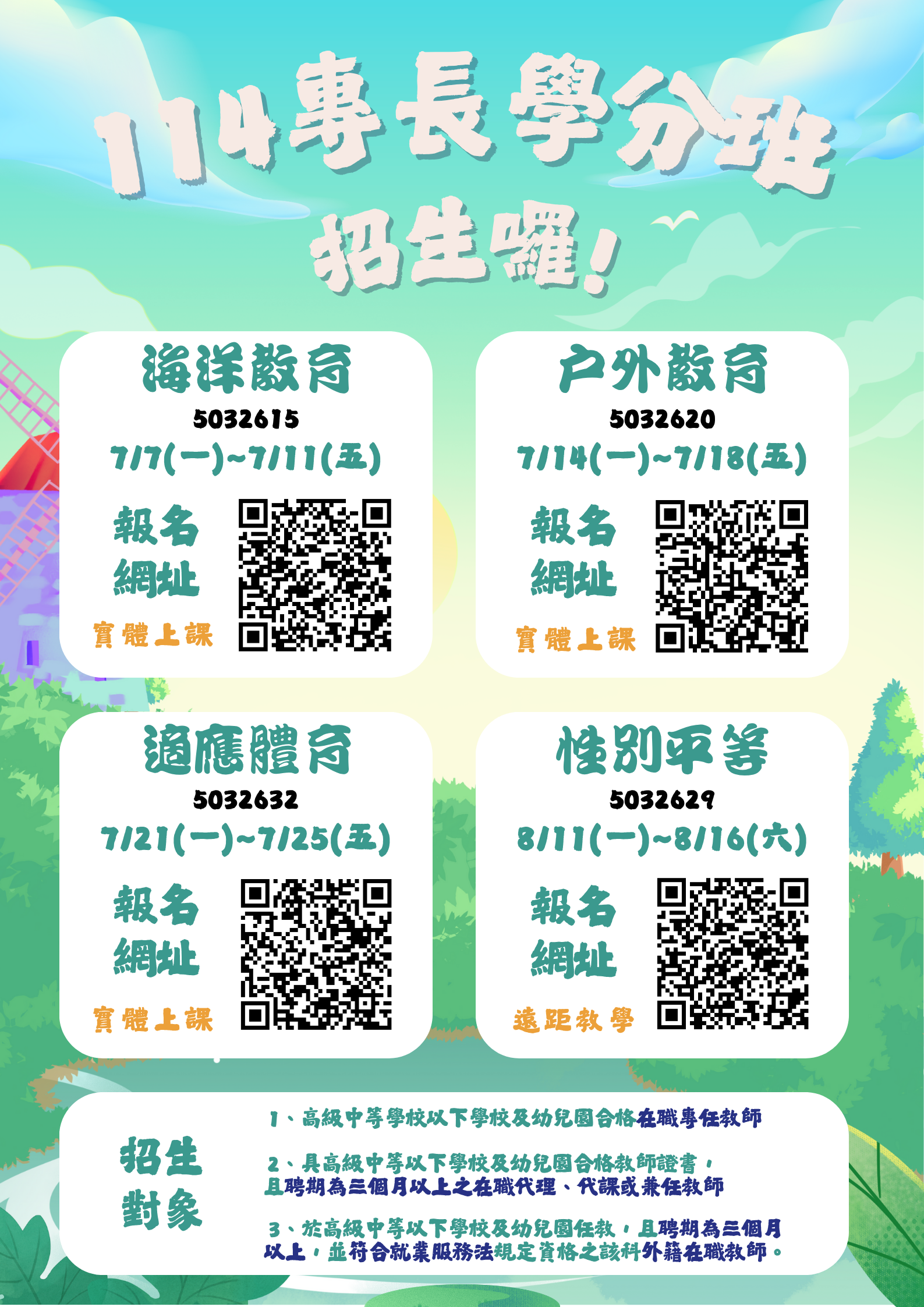 國立屏東大學職涯發展暨教育推廣處推廣教育中心辦理「114年度高級中等以下學校教師在職進修專長增能學分班」,請各校鼓勵教師踴躍報名參加。