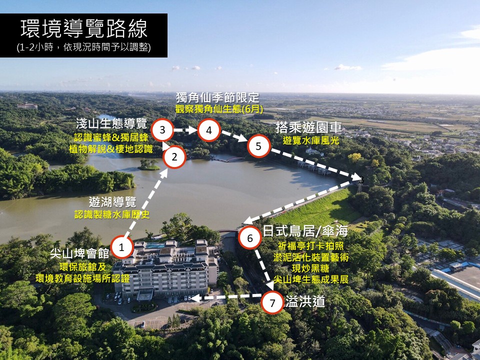 四、該渡假村亦推出季節限定之自然生態導覽活動,包括日間賞蝶與夜間賞螢體驗,透過專業導覽員解說,讓參與者近距離觀察並瞭解尖山埤的豐富生態資源。