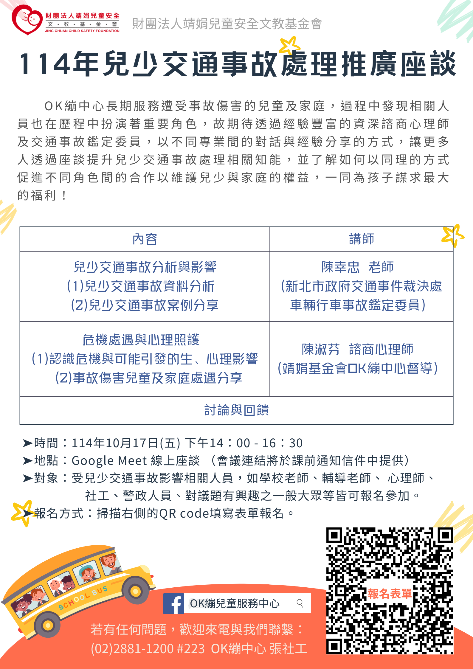 二、財團法人靖娟兒童安全文教基金會將於1141017日(星期五)辦理兒少交通事故處理推廣座談,期待透過對話方式從交通、心理、社會等角度分享中心協助處理交通事故的服務經驗傳達給更多相關工作者,讓不同專業之間以同理的態度更了解彼此,一同協助為孩子謀取最大的利益,惠請各校鼓勵同仁參與。