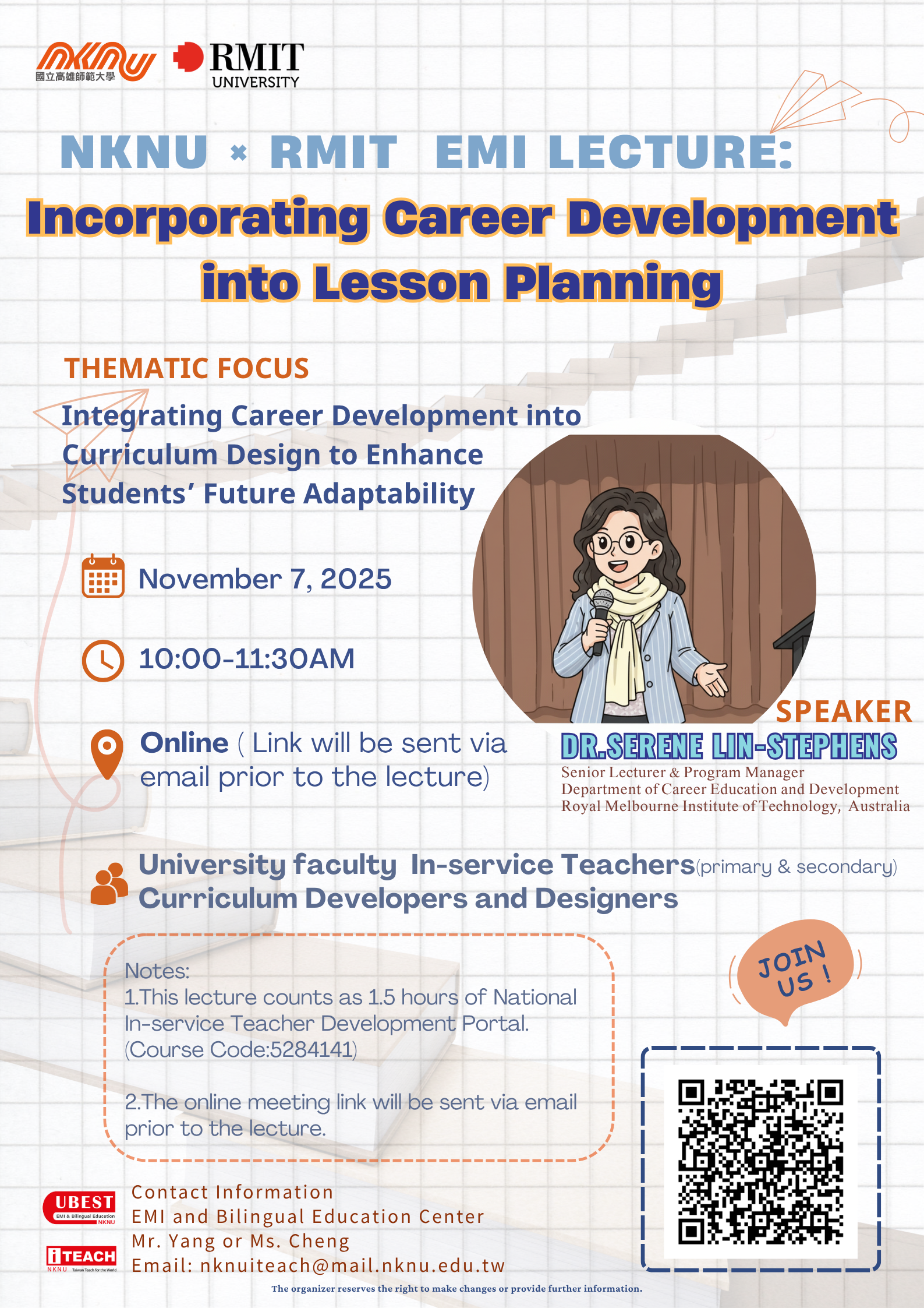 二、為促進大學及中等教育教師瞭解「生涯發展導入課程設計」之教學應用與未來教育趨勢,本校全英語與雙語教學推動中心特邀澳洲皇家墨爾本理工大學( RMIT University ) Dr. Serene Lin-Stephens 主講,講授「Incorporating Career Development into Lesson Planning」。