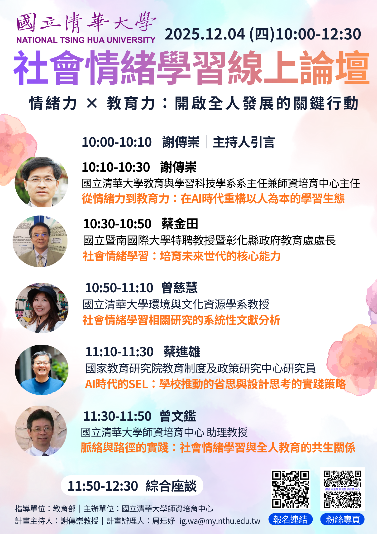 國立清華大學師資培育中心訂於 114 年 12 月 4 日上午 10 時至 12 時 30 分,辦理「社會情緒學習線上論壇-情緒力 × 教育力:開啟全人發展的關鍵行動」線上論壇。詳見附件資料。