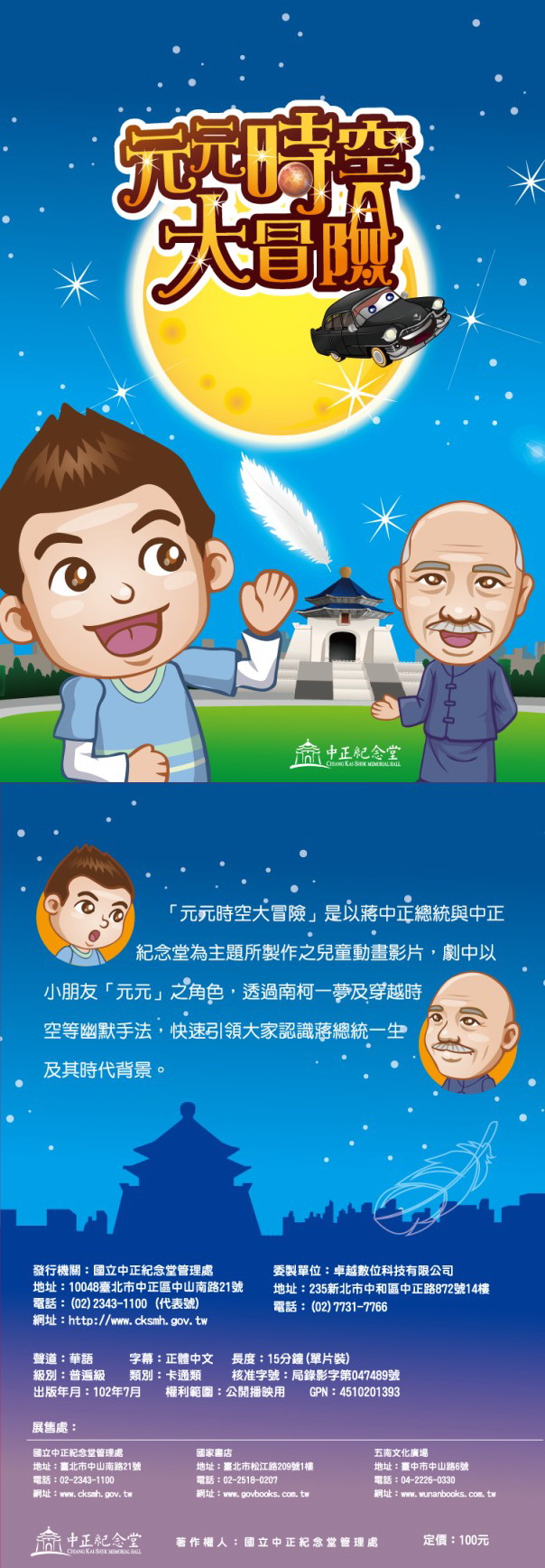 二、旨揭動畫光碟已於本(102)年 7 月出版發行,係以蔣中正總統與中正紀念堂為主題所製作之兒童動畫影片,劇中以小朋友「元元」之角色,透過幽默逗趣之手法,快速引領大家認識蔣總統及其時代背景。
