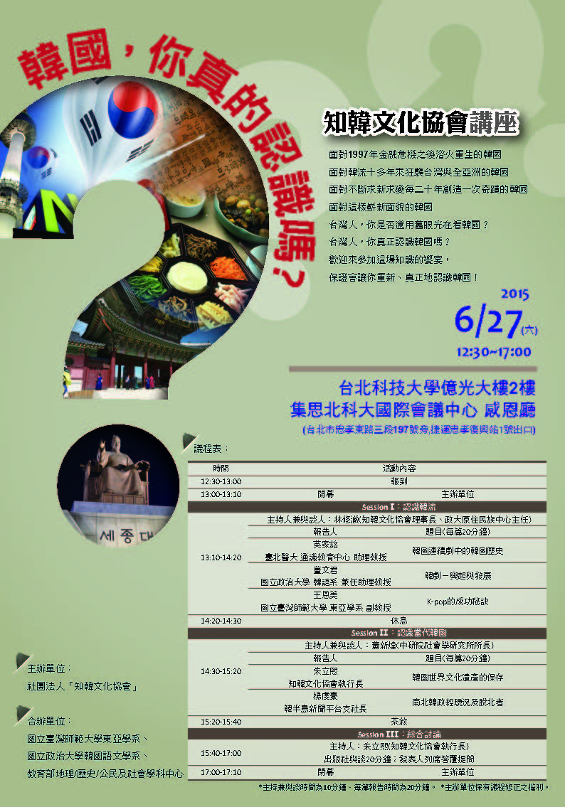 【公告】國立臺灣師範大學東亞系於104年6月27日(六)舉辦「韓國,你真的認識嗎?」知韓文化協會講座,請有興趣之教師踴躍報名參加,請查照。
