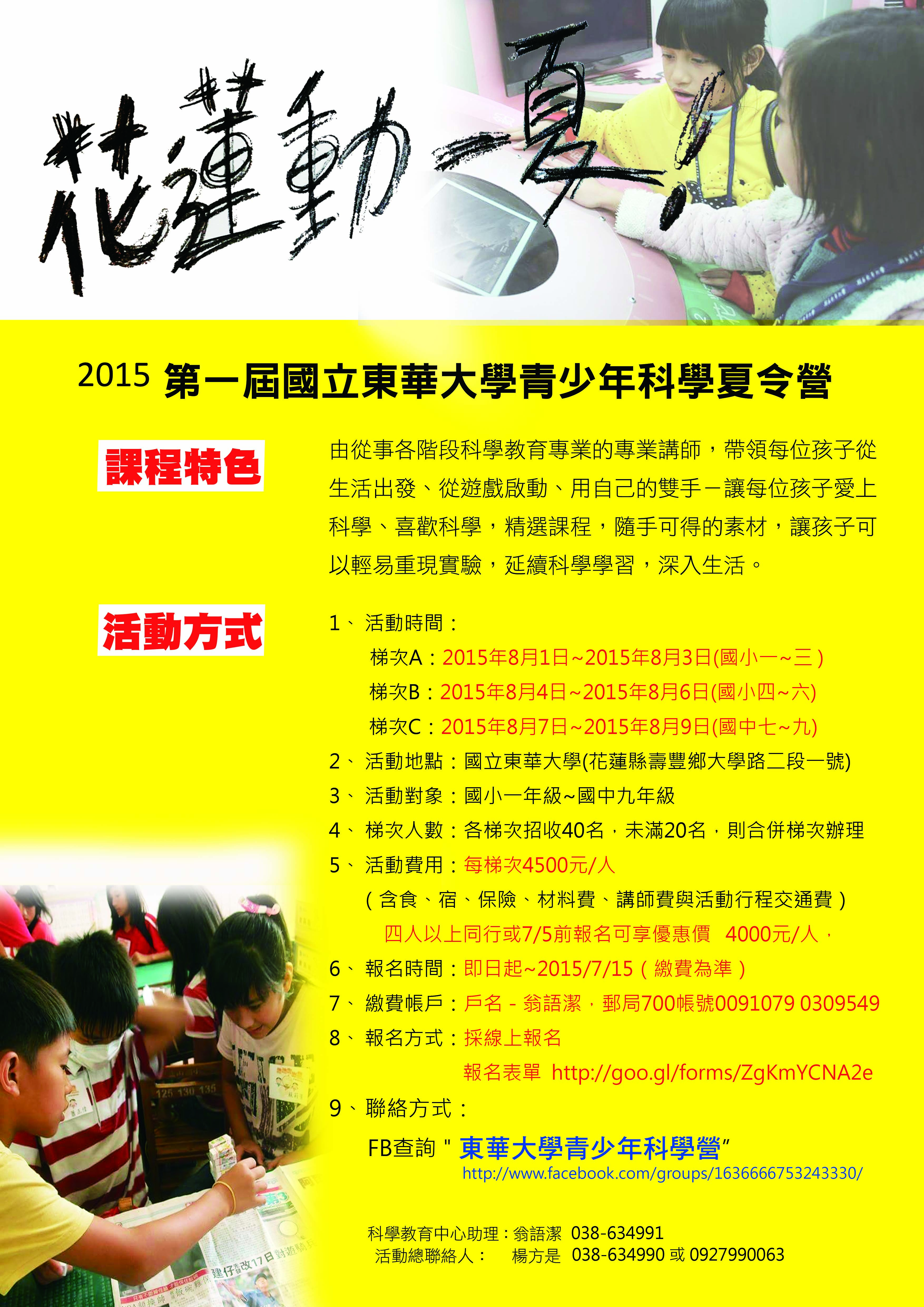 【公告】轉知國立東華大學科學教育中心辦理「『花蓮”動”一夏』2015國立東華大學青少年科學夏令營」,請查照。