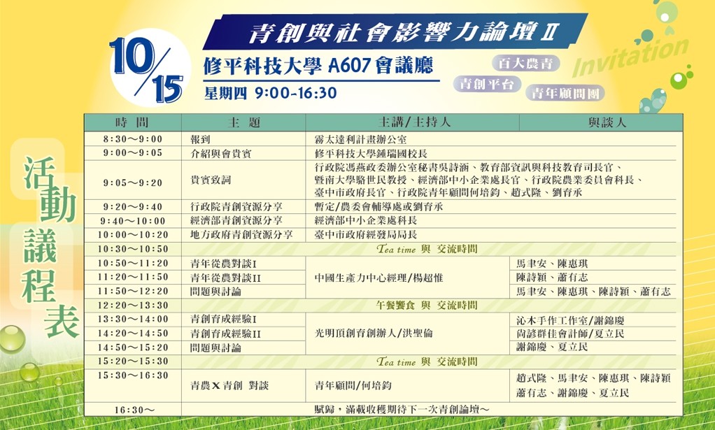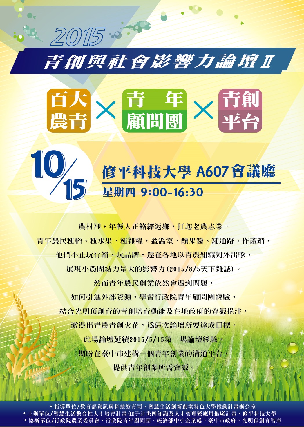 修平學校財團法人修平科技大學訂於104年10月15日(星期四)舉辦「青創與社會影響力論壇II」,敬邀各校師生踴躍報名參加。