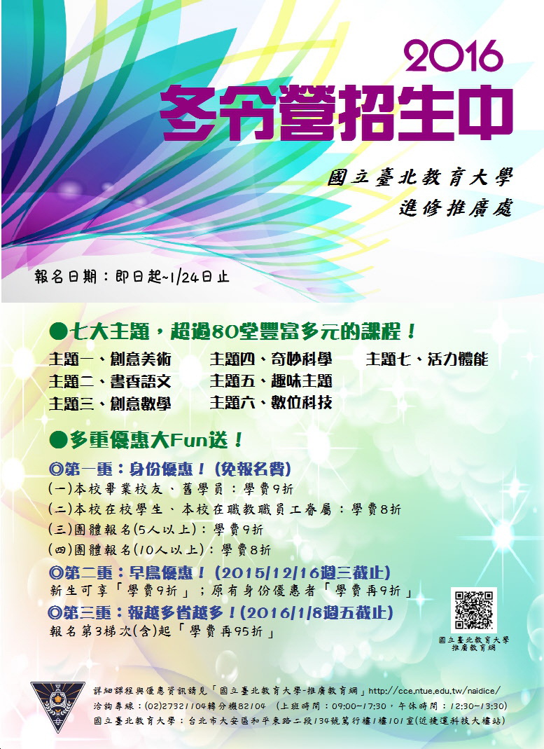 國立臺北教育大學進修推廣處推廣教育中心辦理「2016冬令營」,課程海報及簡章如附。