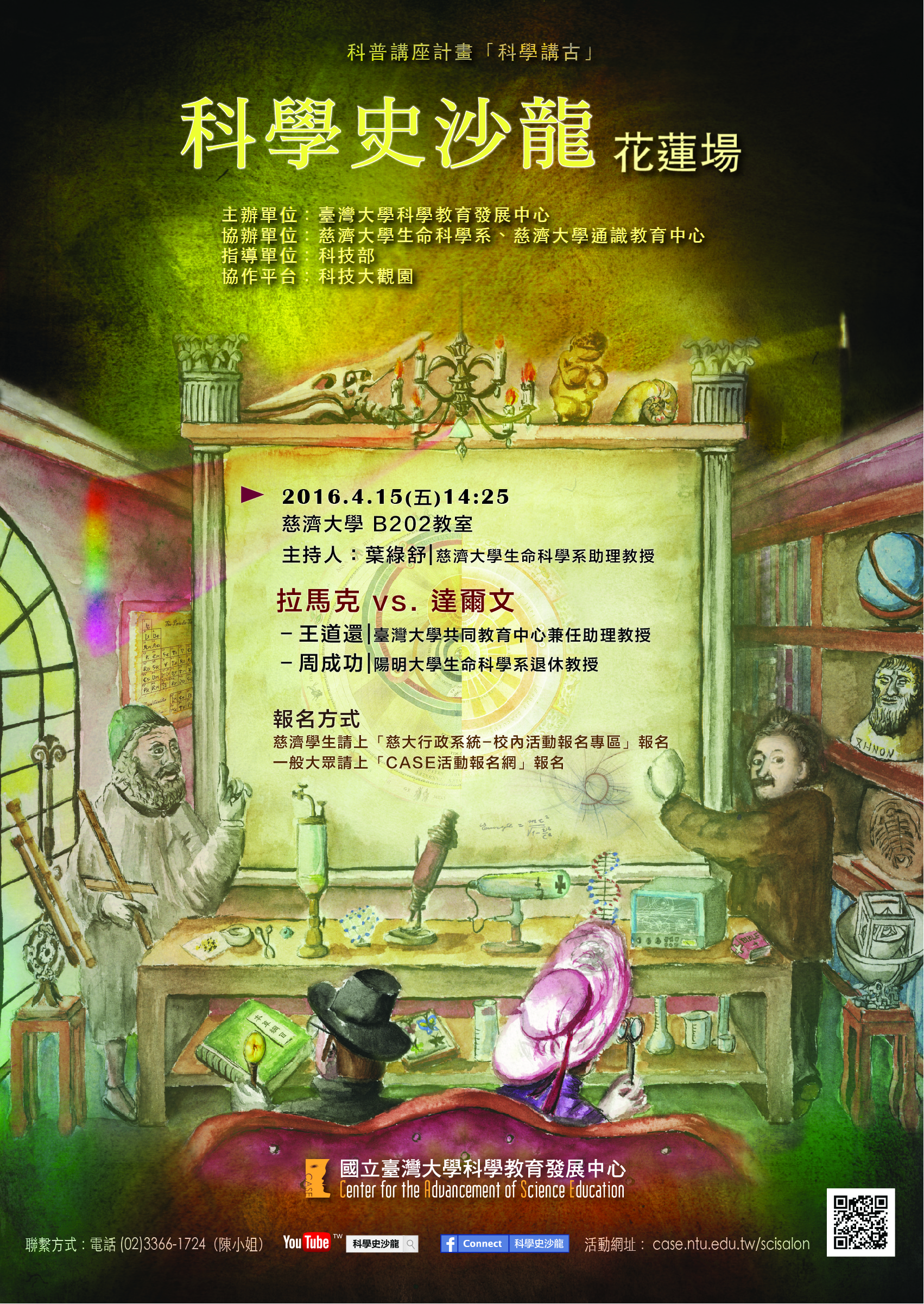 【轉知】國立臺灣大學科學教育發展中心訂於105年4月15日假慈濟大學舉辦「科學史沙龍」講座,請貴校轉知師生相關訊息。