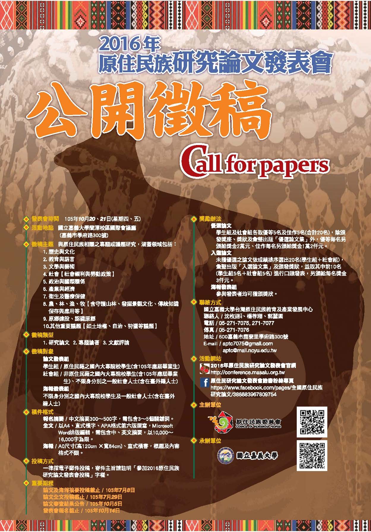 【論文徵稿】檢送國立嘉義大學辦理原住民族委員會「2016年原住民族研究論文發表會」論文徵稿啟事1份,請本縣教職員及學生踴躍投稿,請查照。