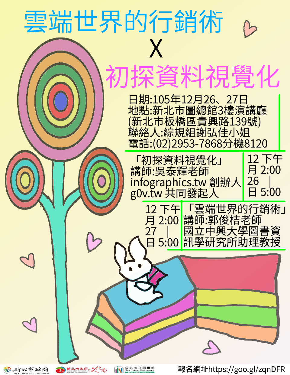 【轉知】新北市立圖書館訂於12月26日(星期ㄧ)及12月27日(星期二)舉辦「初探資料視覺化」和「雲端世界的行銷術」演講活動,請所屬踴躍報名參加。