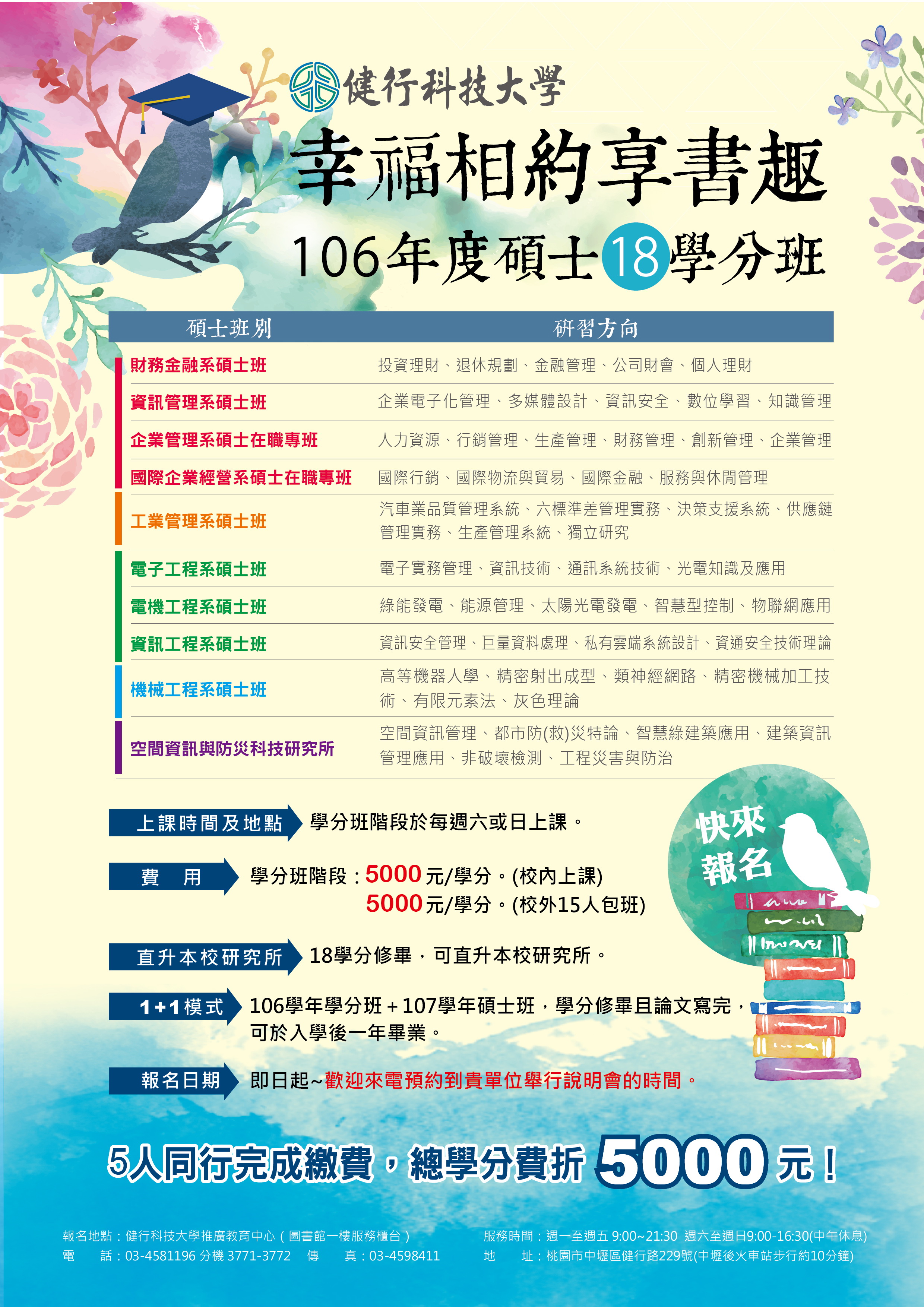 轉知 健行學校財團法人健行科技大學推廣教育中心辦理「碩士18學分班」,請踴躍報名參加。