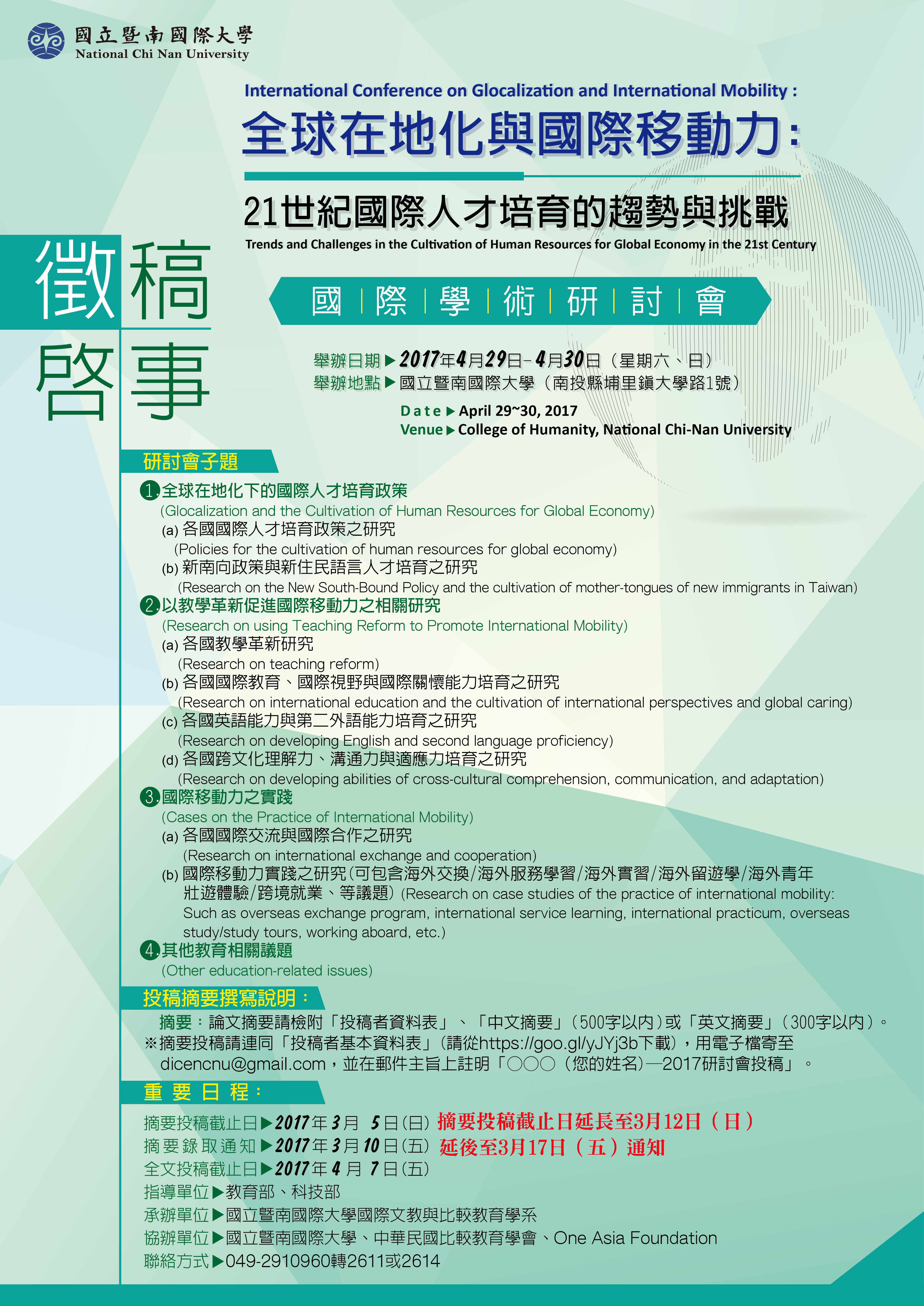【公告】轉知國立暨南國際大學辦理「全球在地化與國際移動力: 21世紀國際人才培育的趨勢與挑戰」國際學術研討會徵稿日期延長至106年3月12日,請本縣各國民中小學校鼓勵所屬教師踴躍報名參與。