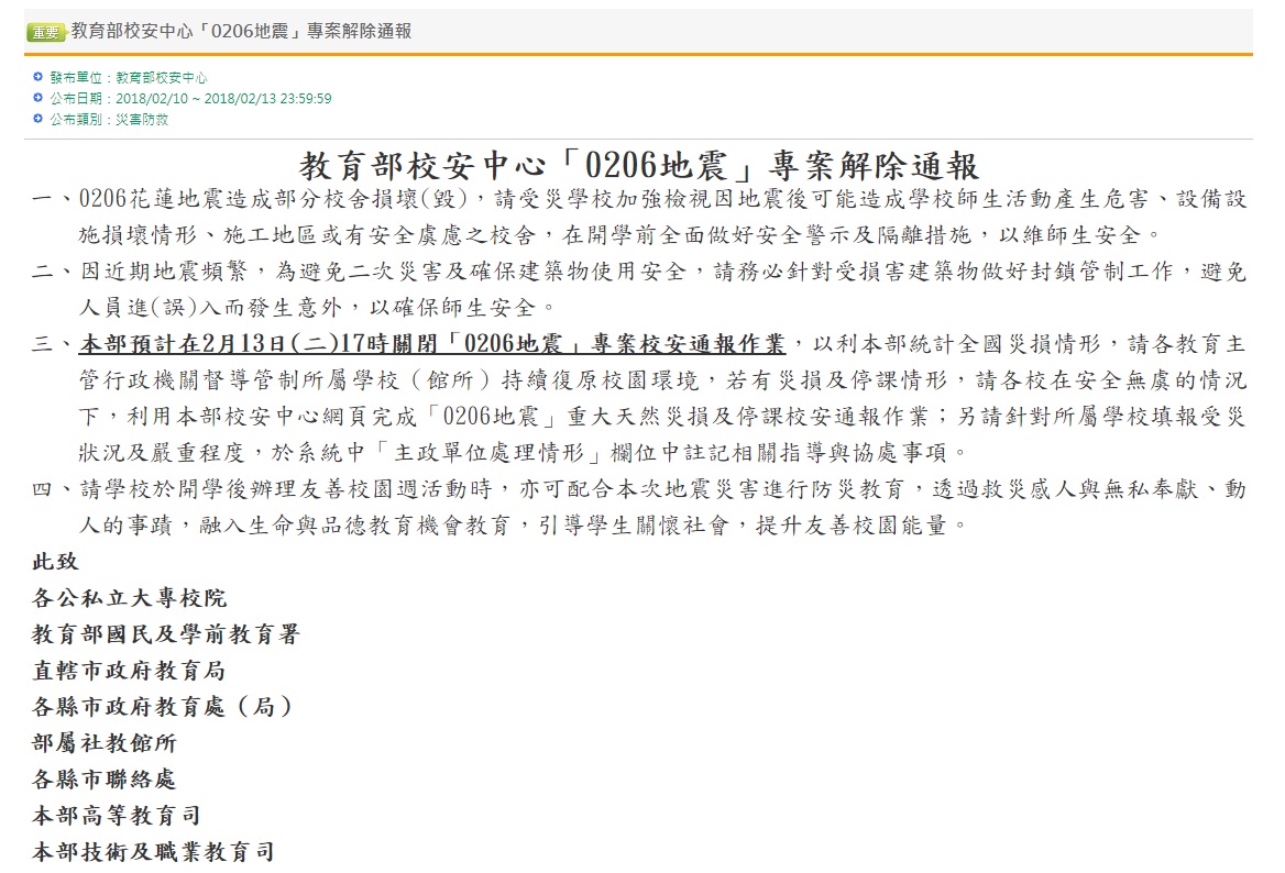 【重要通知】2/10教育部校安中心公布「0206地震」專案解除通報,請各校承辦人員按時點閱公告,並請各級學校留意校安中心將於2月13日(二)17時關閉「0206地震」專案校安通報作業。