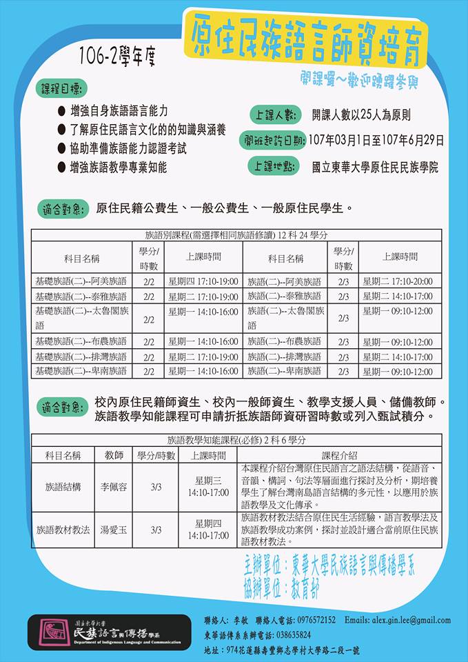 ☆重要研習公告☆參與東華大學辦理「106年度原住民族語師資培育計畫課程」,請參與之老師公假登記,請查照。