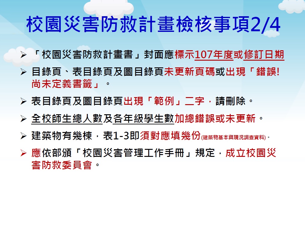 參加第一梯次校園災害防救計畫審查作業工作坊的學校經過審查委員說明那些章節內容需修正,您修正完成的校園防救計畫,最晚請於 6 月 7 日 17:00 止,將電子檔上傳到花蓮縣防災教育深耕網的 107 學校執行成果的欄位裡,審查委員們會做第 2 次的審查。