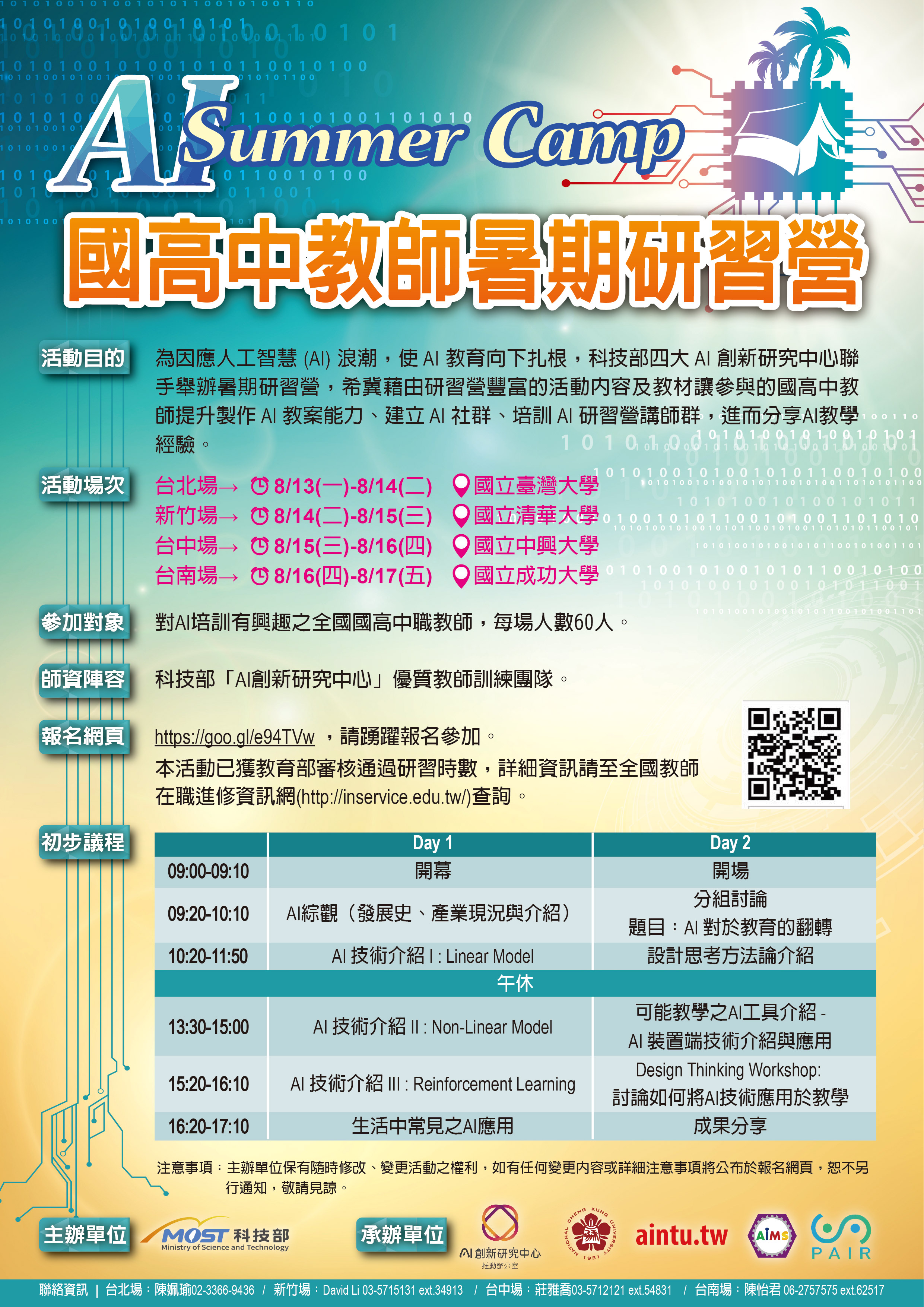 【轉知】科技部辦理「國高中教師暑期研習營(AI Summer Camp)」,敬請各校教師踴躍報名參加,請查照。