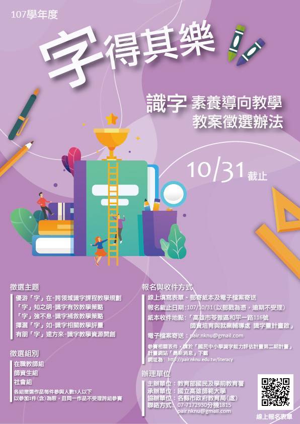 【教案徵選】國立高雄師範大學辦理「識字素養導向教學」教案徵選,鼓勵各校教師踴躍報名參加。