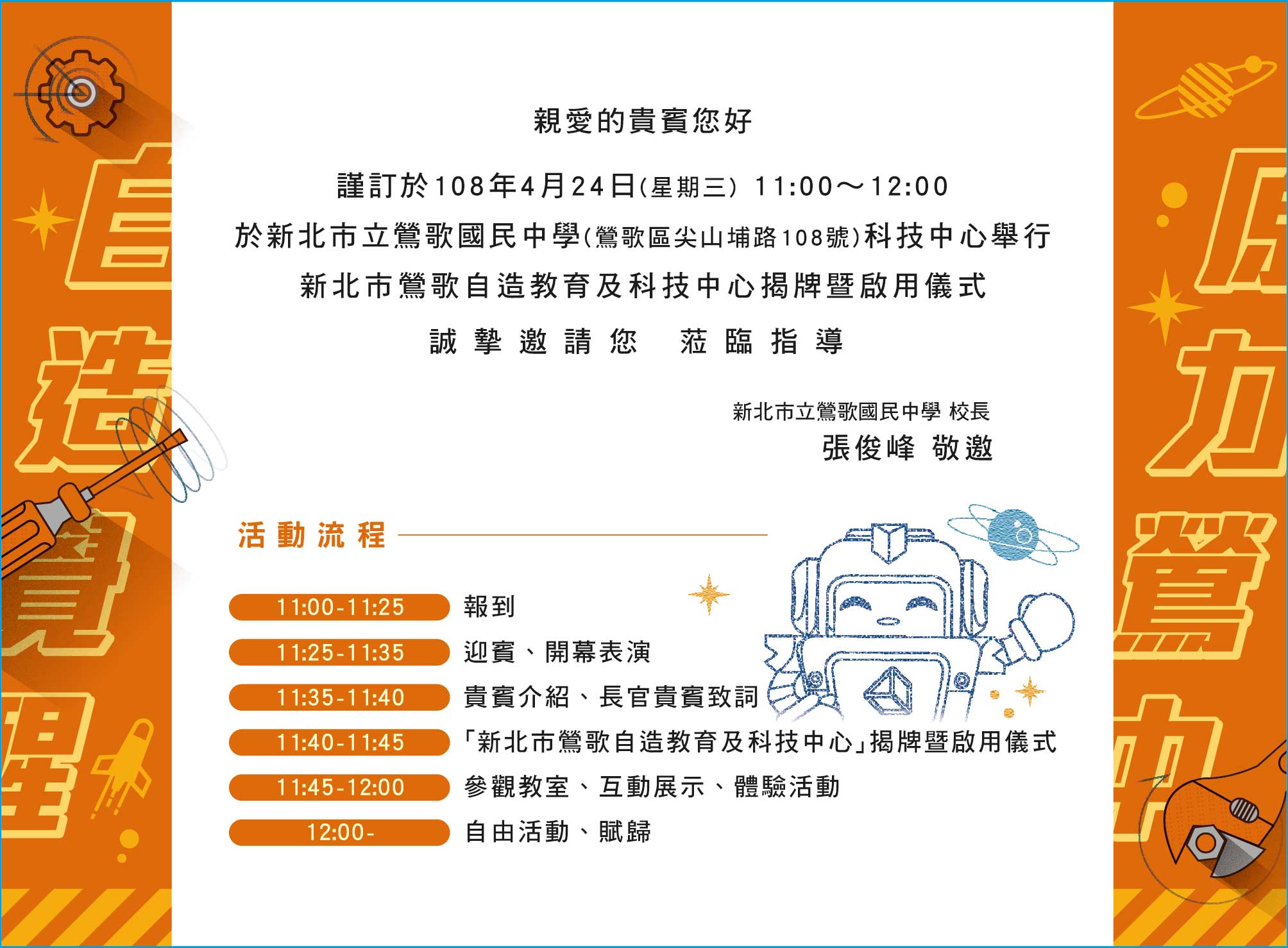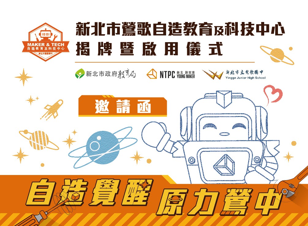 【轉知】新北市政府教育局辦理「新北市鶯歌自造教育及科技中心揭牌啟用典禮」,詳如說明。