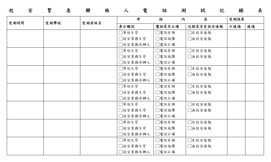 1) 校安緊急聯絡人電話測試記錄表