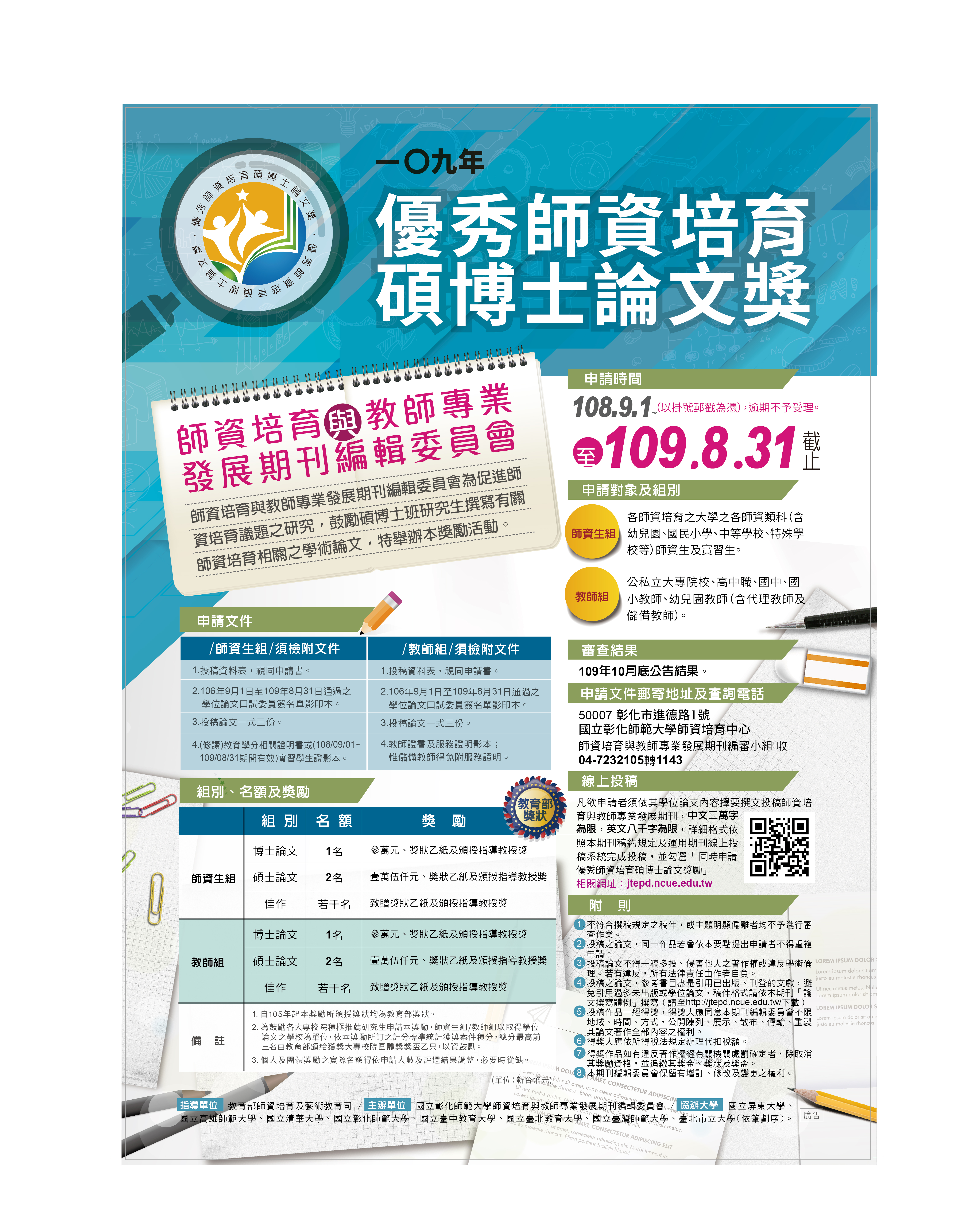轉知 國立彰化師範大學師資培育與教師專業發展期刊編輯委員會「優秀師資培育碩博士論文獎」徵稿訊息,請踴躍參加。