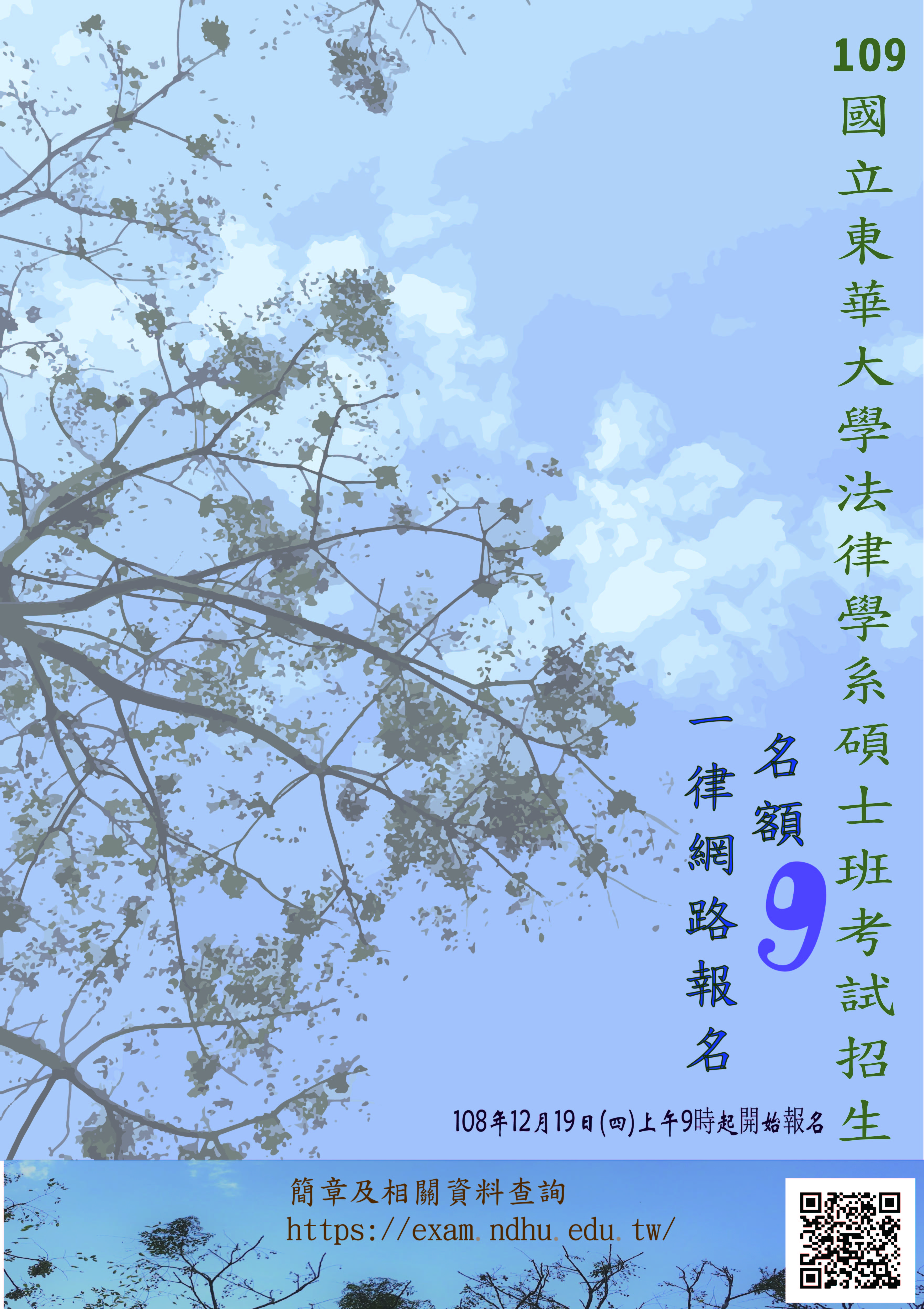 轉知 國立東華大學109學年度法律學系碩士班考試招生訊息,請踴躍報考。