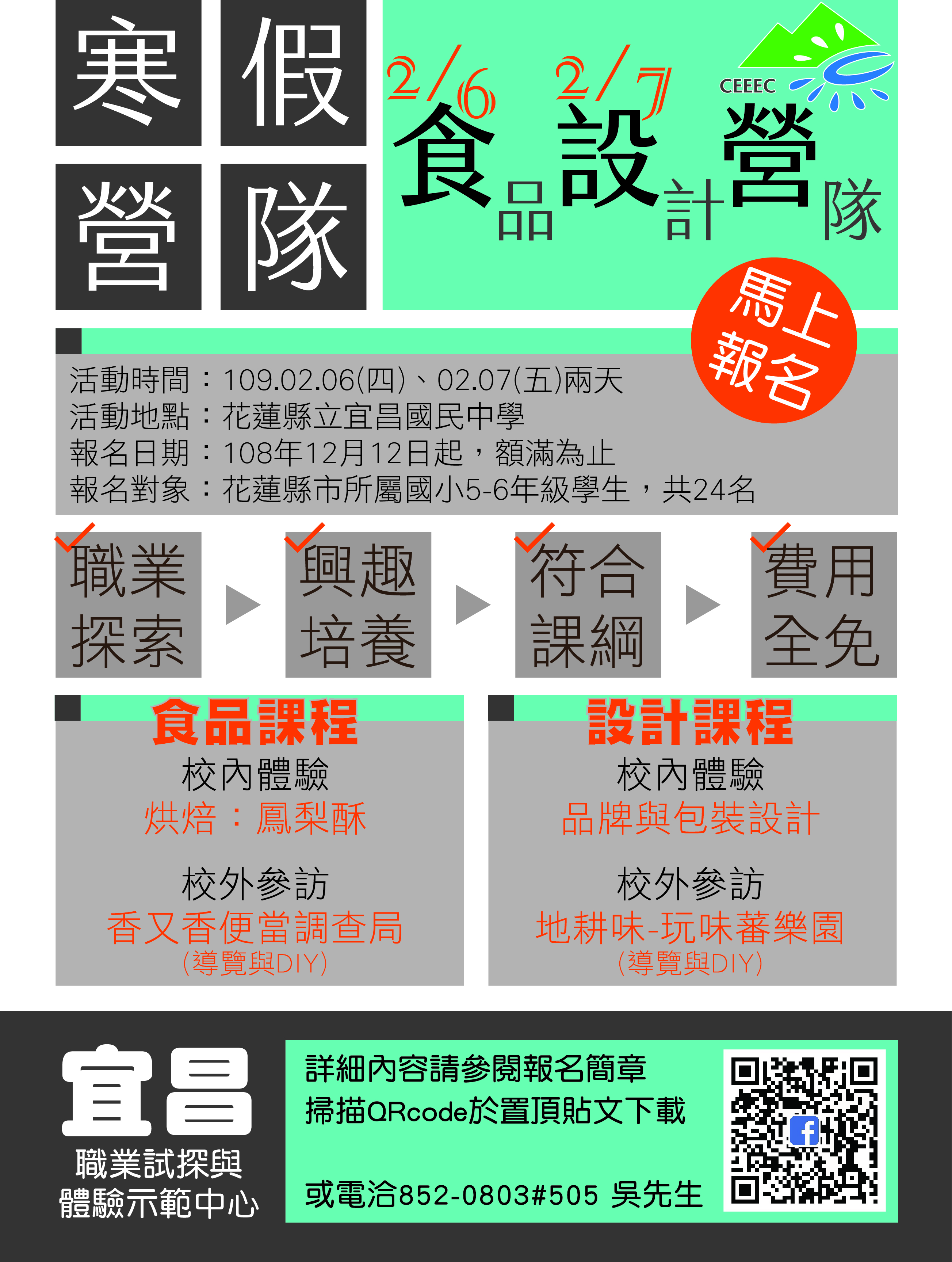 【轉知】本縣宜昌國中區域職業試探與體驗示範中心108學年度寒假課程相關資料,即日起開始報名,請各校鼓勵學生踴躍參加。
