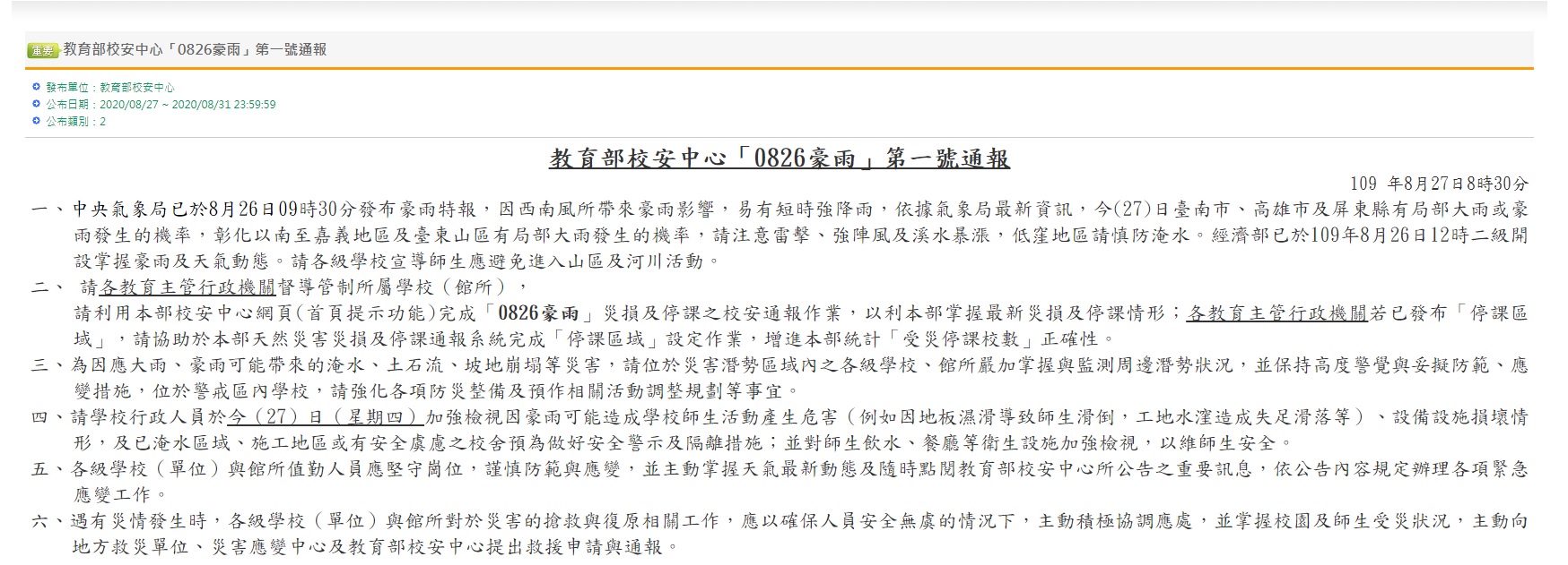 【重要通知】教育部校安中心「0826豪雨」第一號通報通報點閱期限至8/31:59:59止,請各校承辦人員按時點閱公告並依說明辦理。