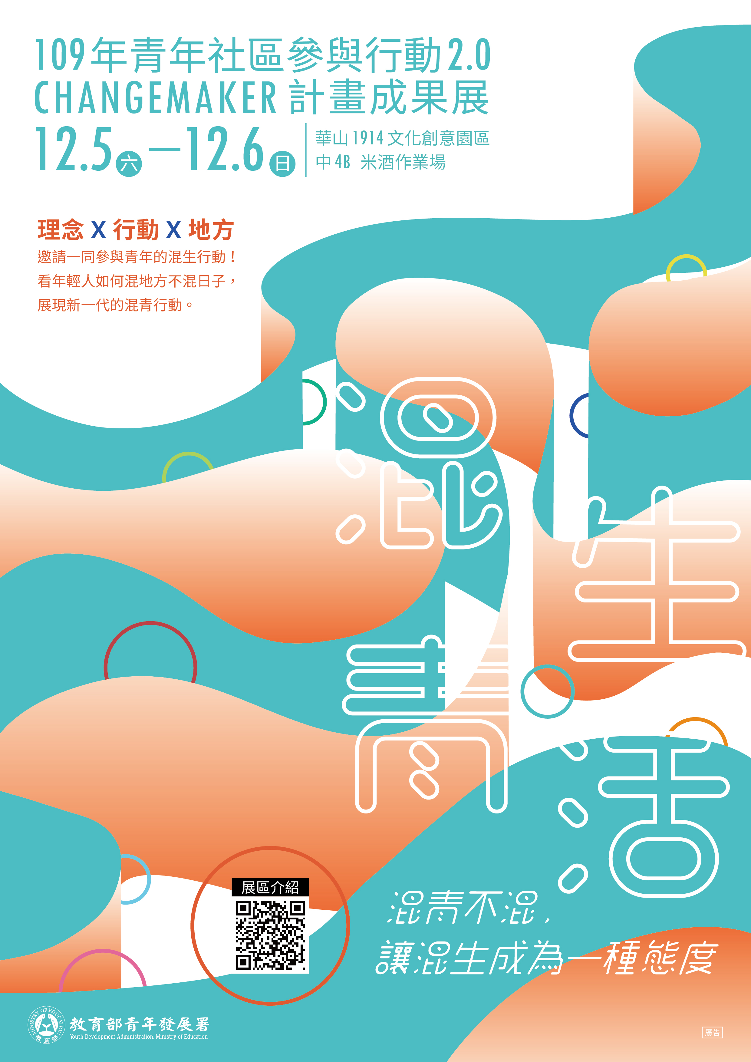轉知教育部青年發展署辦理109年青年社區參與行動2.0 Changemaker計畫(下稱Changemaker計畫)成果展─「混青生活 」,請查照。