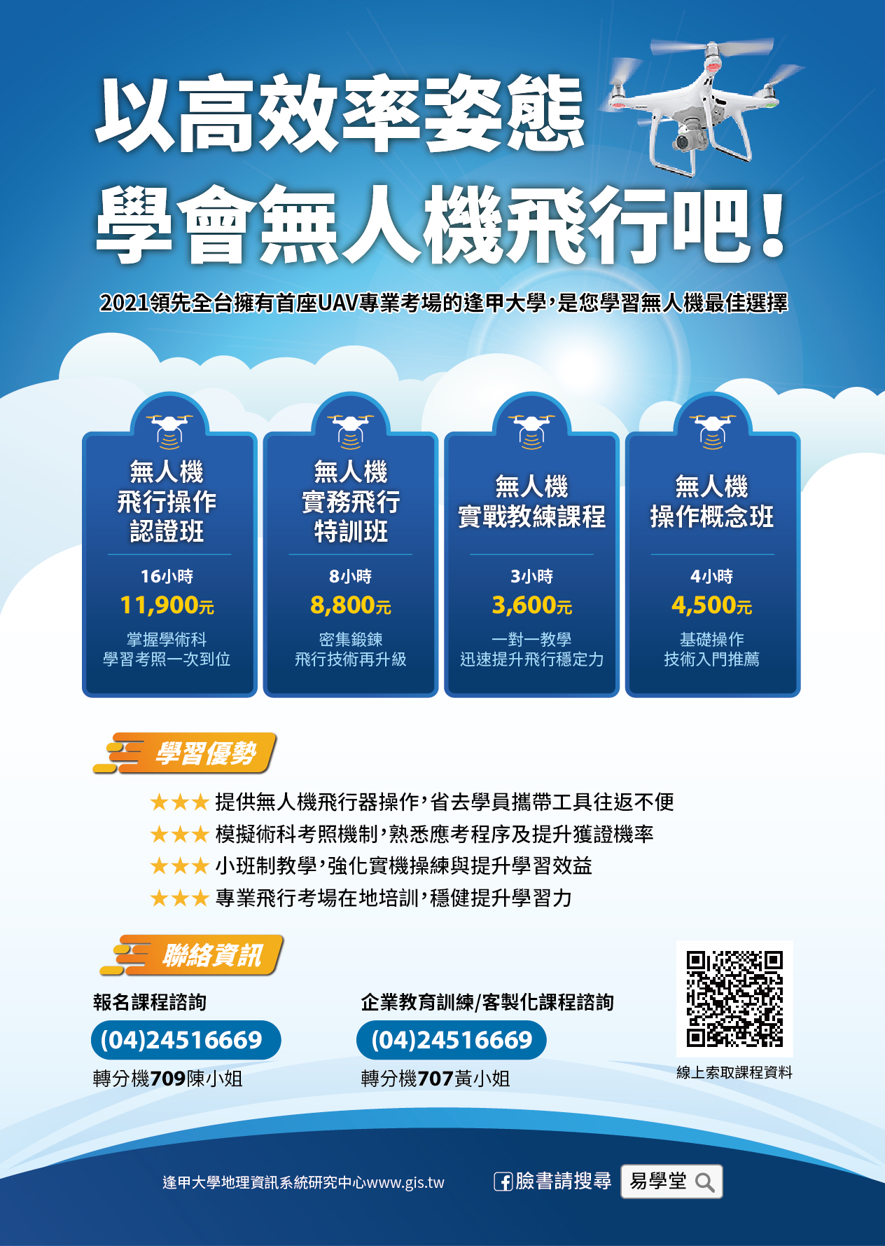 【轉知】有關逢甲大學地理資訊系統研究中心辦理無人機系列課程,請轉知所屬師生並鼓勵踴躍參與,請查照。
