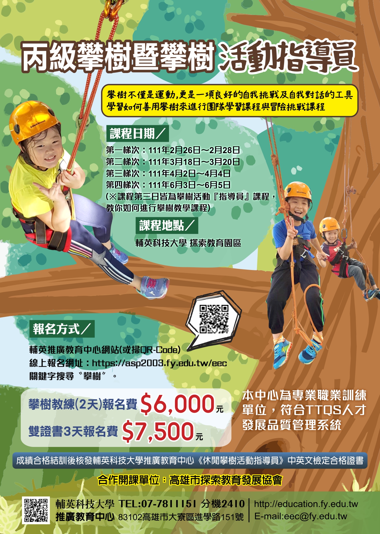 二、輔英科技大學推廣教育中心探索教育組辦理「丙級攀樹暨攀樹活動指導員」研習認證課程,自即日起開始受理報名,詳細課程內容如招生簡章。
