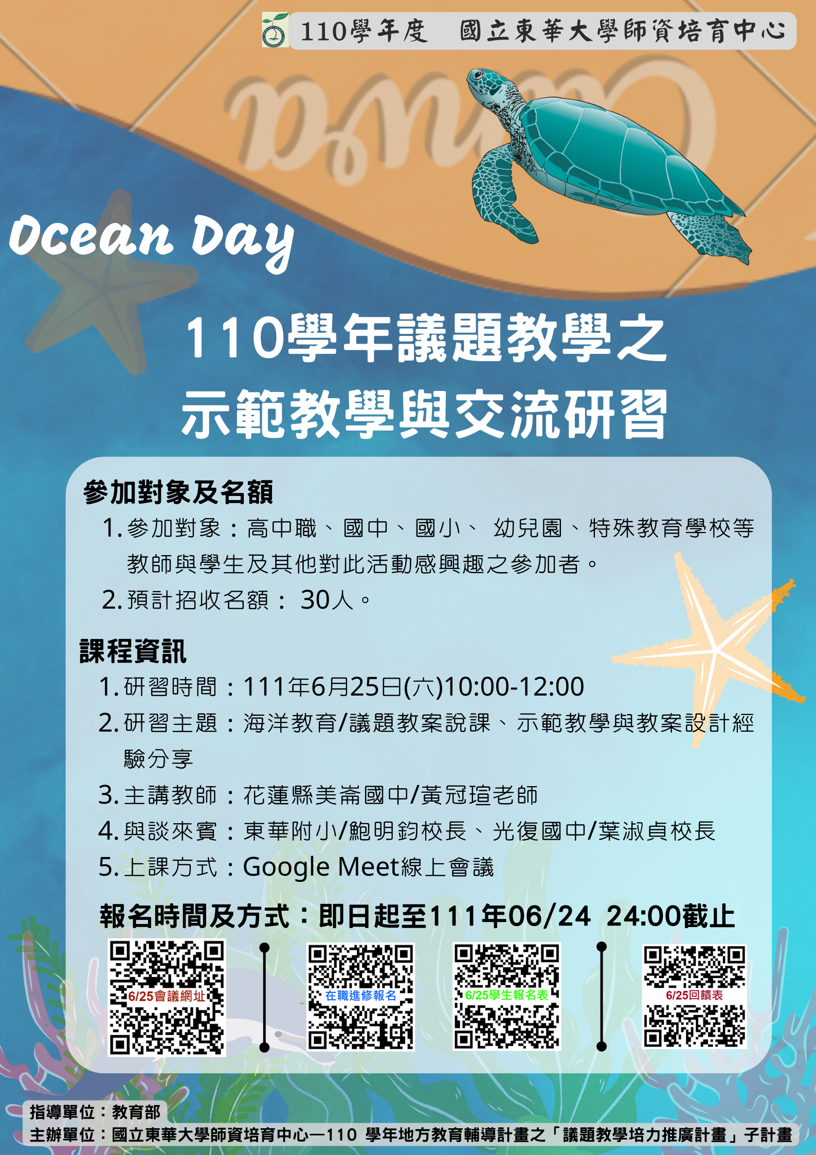 (二) 主辦單位:國立東華大學師資培育中心—110 學年地方教育輔導計畫之「議題教學培力推廣計畫」子計畫。