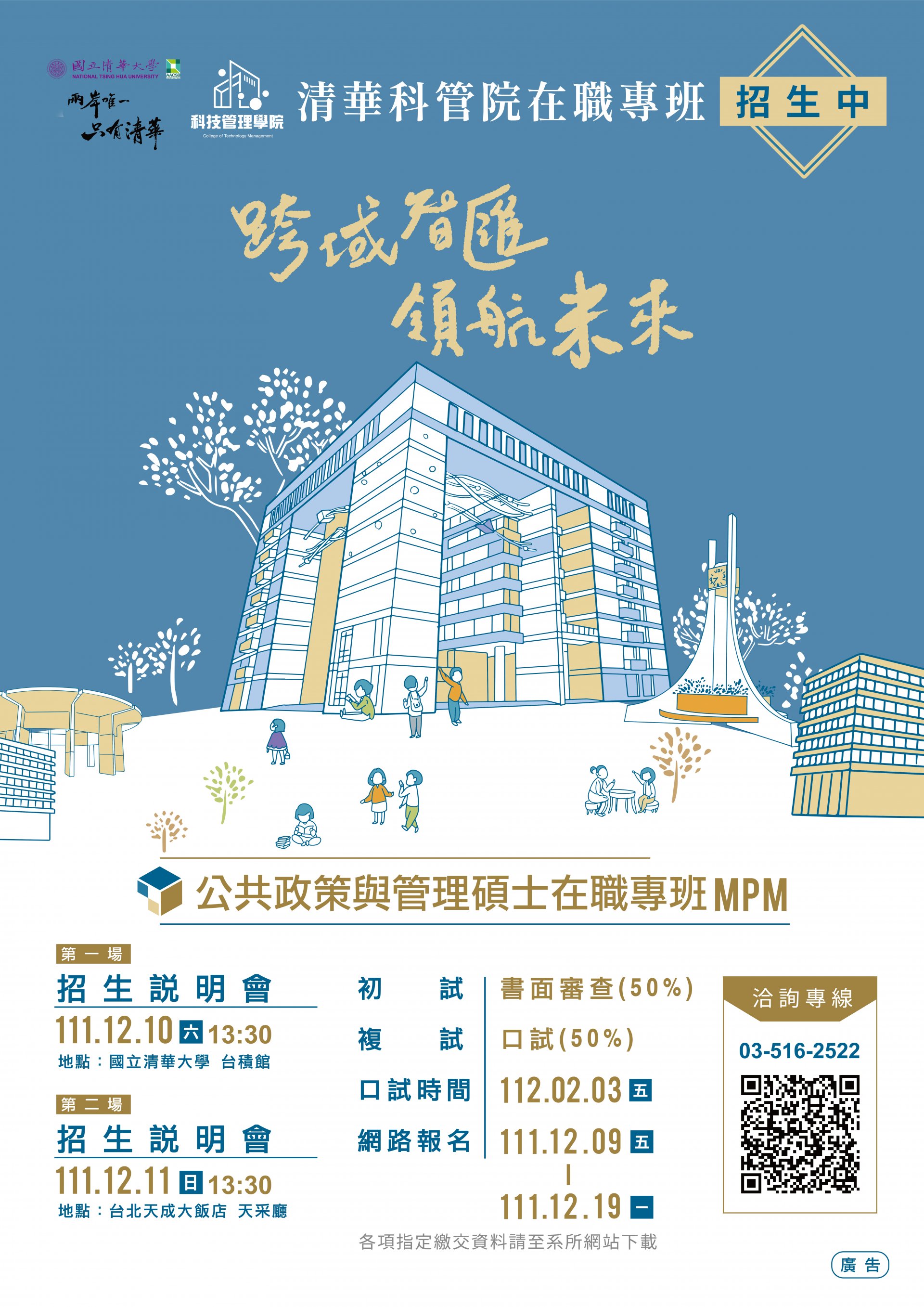 國立清華大學科技管理學院公共政策與管理碩士在職專班112學年度招生,請各校轉知校內同仁踴躍報名。