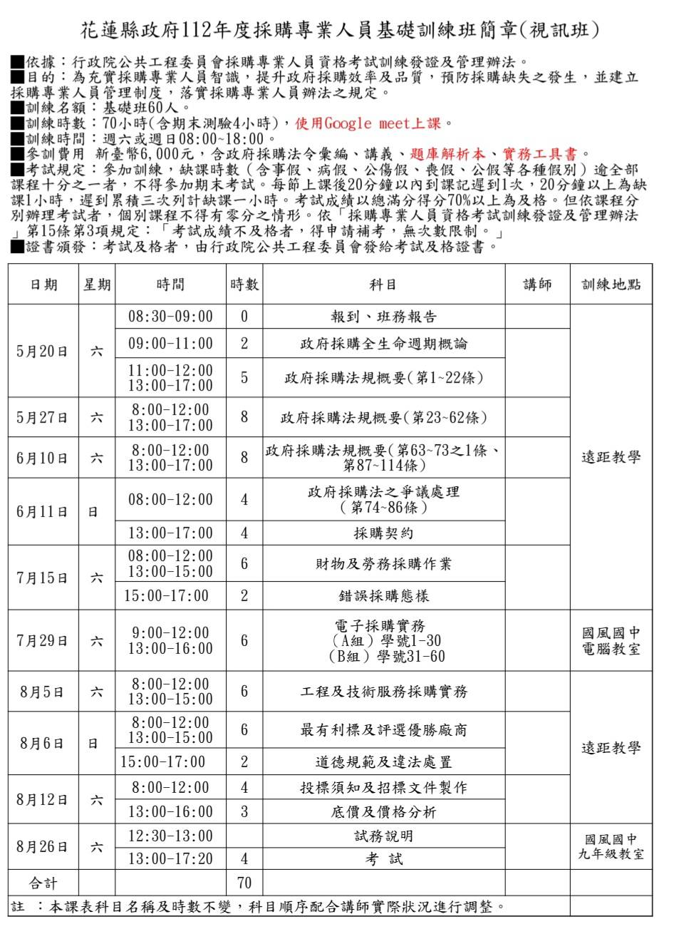 112年度採購專業人員基礎訓練班(視訊班)課程表,詳如附件