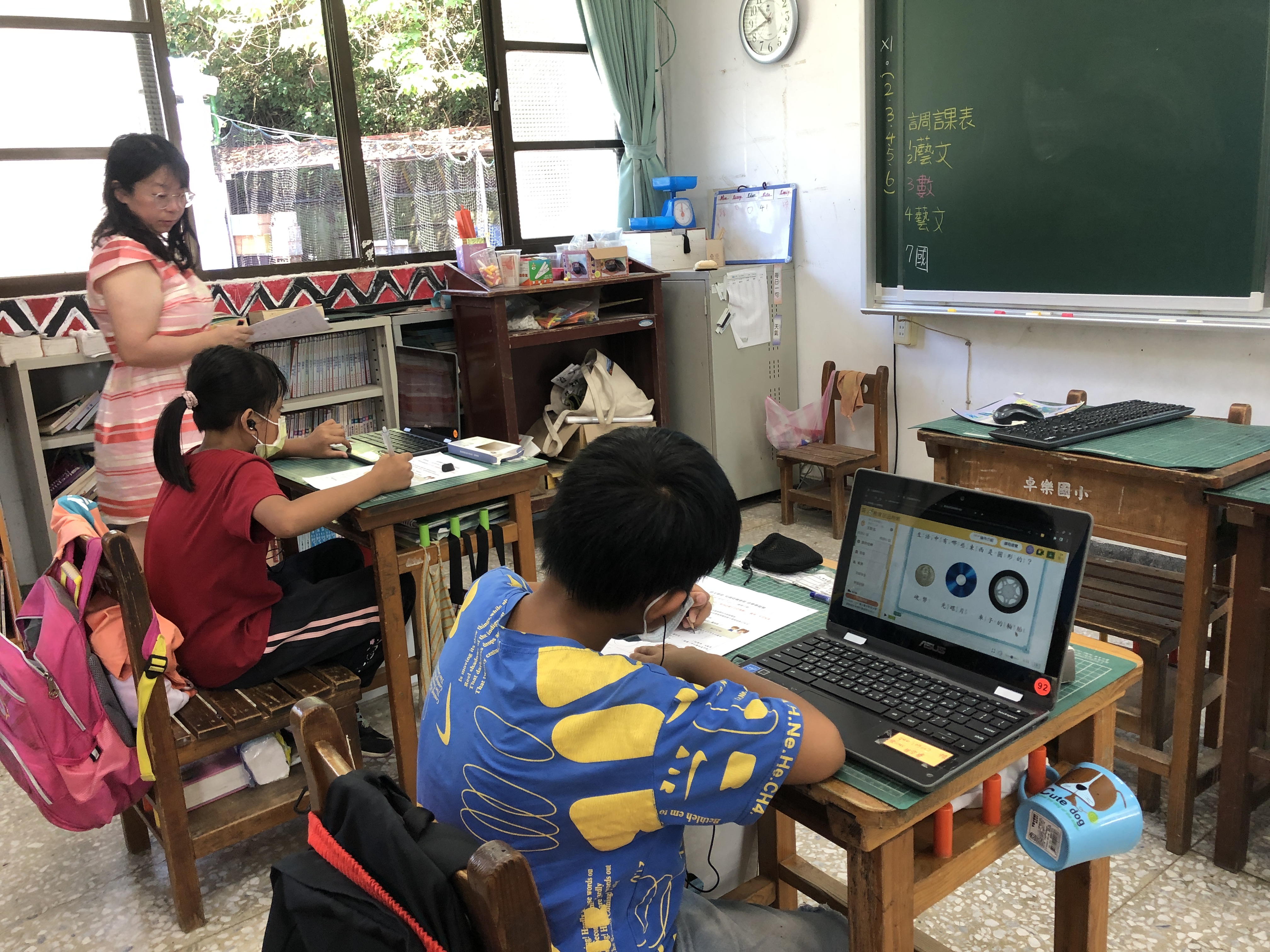 學生利用因才網進行自主學習,老師巡堂了解學生學習情形。(卓樂國小)