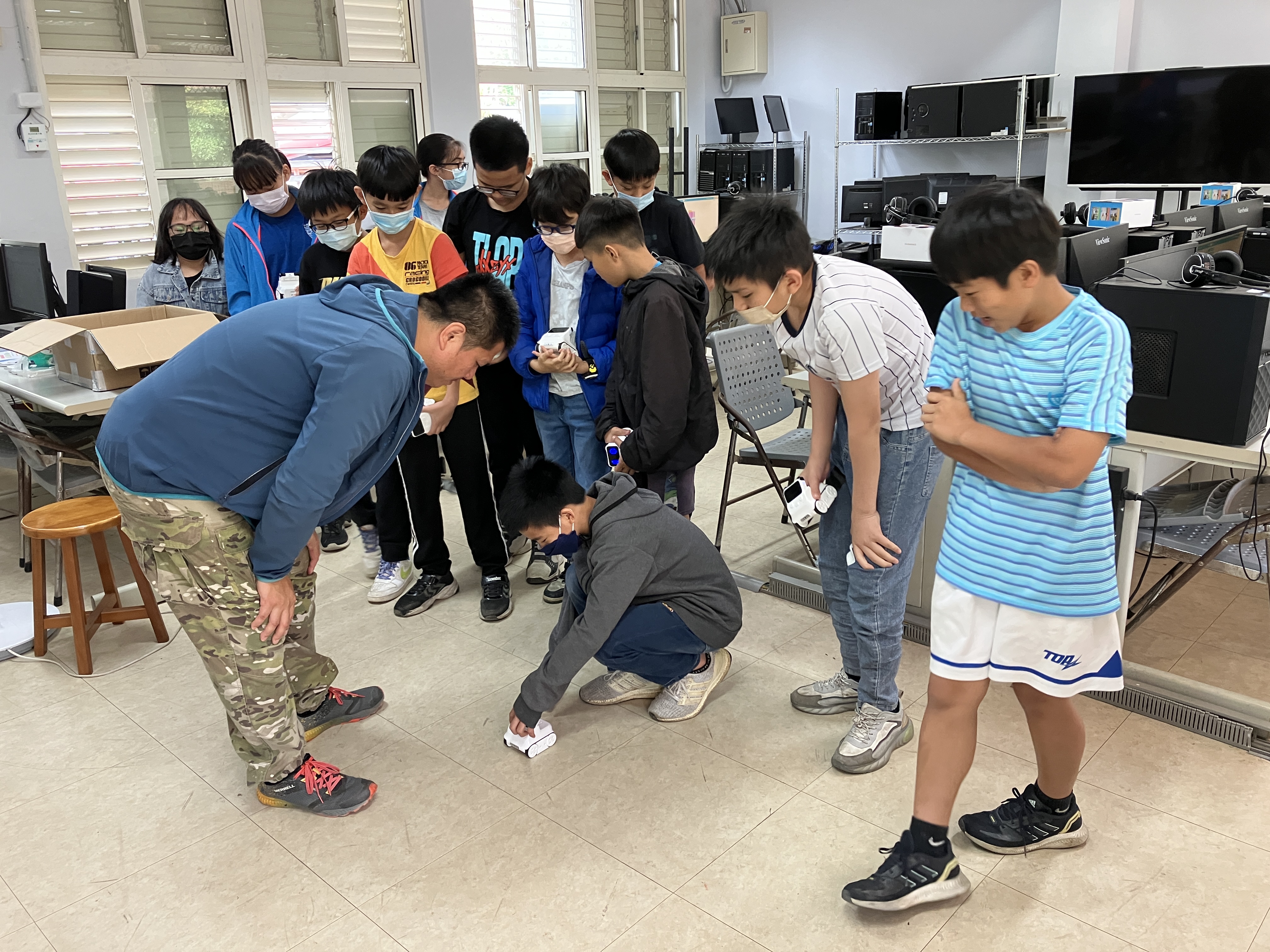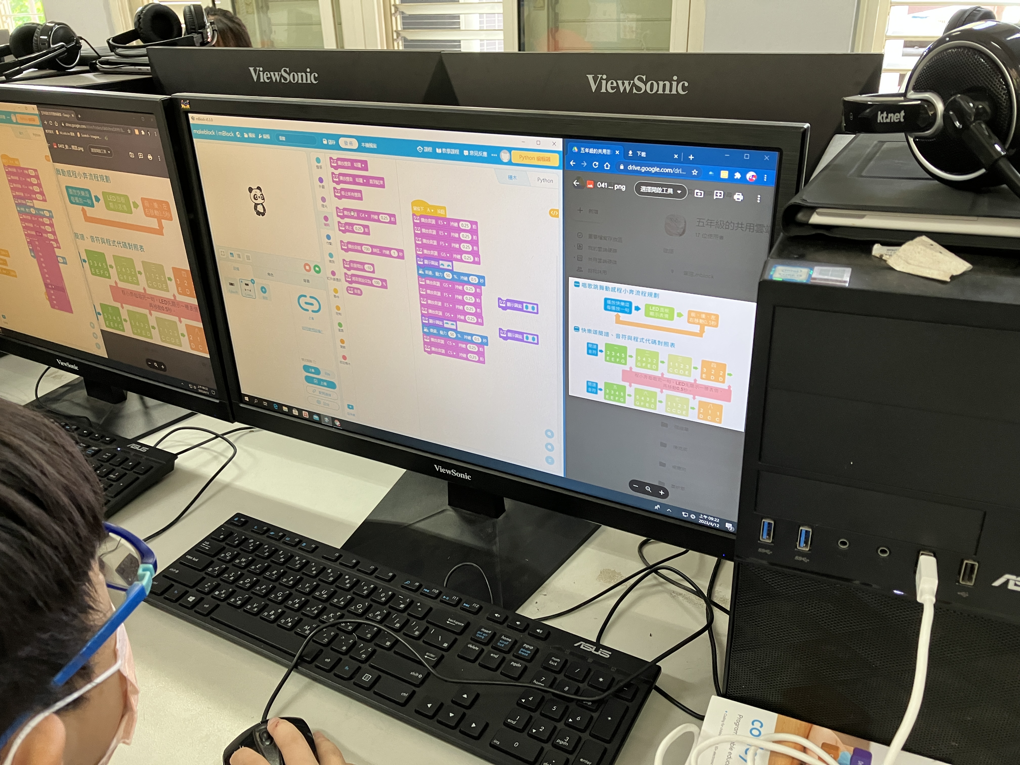 銅門國小張信儒主任在自造教育課程,帶五年級孩子以mblock編寫經典曲子《快樂頌》。主任教導孩子簡譜、音符與程式碼的對照,設定間隔時間來譜曲,加上設計機器人LED面板上的表情與動作,載歌載舞的機器人模樣深受孩子們喜歡。課程最後除了展現個人成果,也以機器人大合奏的方式呈現,讓孩子們玩得不亦樂乎,是相當成功的一次結合音樂與科技的跨域課程。