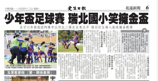 二○二一年全國少年盃足球錦標賽,經過學校男女、公開男女等九組激烈鏖戰,十一日提前上演女子六年級組冠軍爭奪戲碼,全校不到百人的花蓮瑞北國小展現絕佳奮戰精神,逆轉一比一追平勁敵台東太平聯隊,雙方激戰到延長賽仍難分勝負,最終在PK賽中,瑞北小將以四比二為花蓮勇奪首冠佳績,陣中第一射手張羽忻在五場比賽中,個人包辦八進球,獲頒金靴獎。