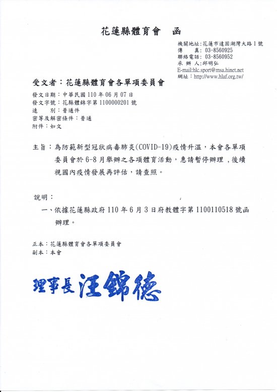 依據花蓮縣政府110年6月3日府教體字第1100110518號函,本會各單項委員會6-8月舉辦之各項活動暫停辦理 ,惠請查照. 也請預定在這期間辦理賽事各單項委員會,於6月底前再發文至體育會辦理延期,感謝配合.