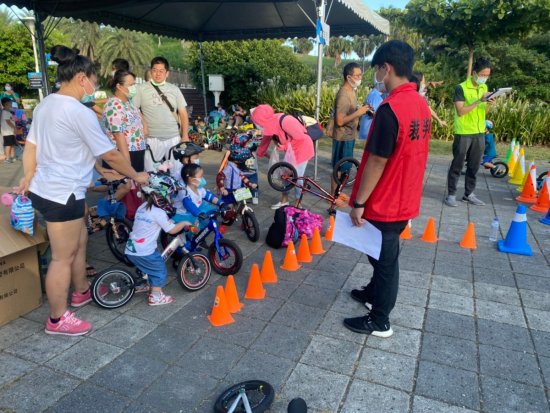 隨即進行滑步車親子運動嘉年華,讓小朋友從小建立正確自行車騎乘觀念,藉由幼兒滑步車運動,提升幼兒應具備的平衡感,以及肢體協調能力,分~2-3歲組(賽道長度150公尺)障礙賽道70公尺、滑步車道80公尺。4-8歲組(賽道長度:300公尺)障礙賽道120公尺、滑步車道180公尺進行,現場加油聲此起彼落,活動就在熱鬧有趣的氣氛中圓滿結束。