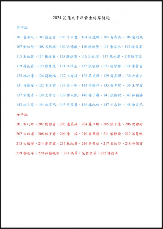 ※「2024花蓮太平洋黃金海岸健跑活動,提前於當天下午14:50起跑,請參加活動民眾提早就位。」