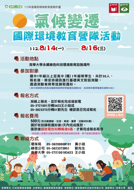 檢送本校辦理「112年度暑假國際氣候變遷環境教育營隊」活動簡章及海報,敬請惠予宣傳並鼓勵學生踴躍報名參加