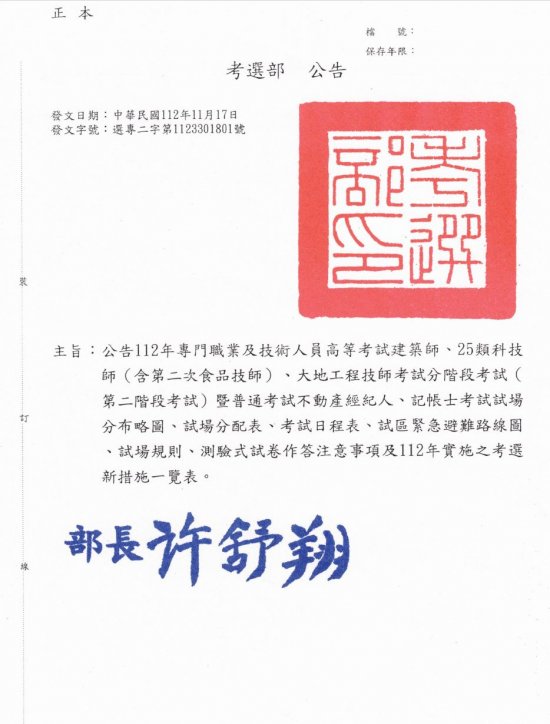 一、依據考選部112年11月17日選專二字第1123301801號公告辦理。