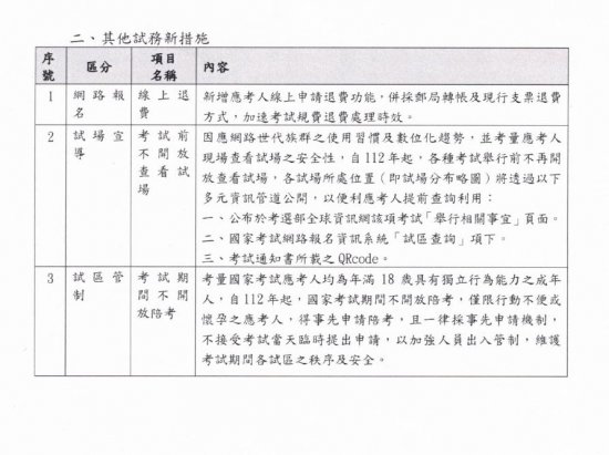 (一)考試前不開放查看試場:因應網路世代族群之使用習慣及數位化趨勢,並考量應考人現場查看試場之安全性,自112年起,各種考試舉行前不再開放查看考場,各試場所處位置(即試場分布略圖)將透過以下多元資訊管道公開,以便利應考人提前查詢利用: