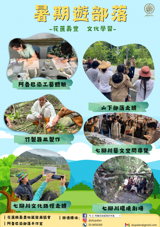 - 多項遊程體驗活動客製半日或一日遊程,或依學校機關需求設計體驗課程,有任何需求皆可聯繫洽詢,辦公室電話:(03)8656360,電子信箱:alupalan@gmail.com,或上FB搜尋「阿魯巴染部落手作室」聯繫小編,網址:https://www.facebook.com/alupalan。